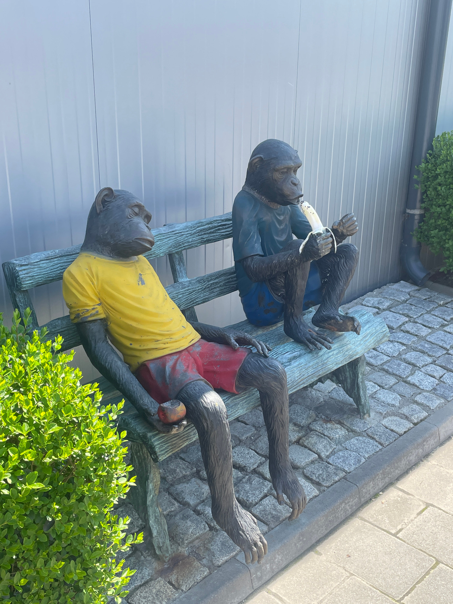 Two monkey statues are sitting on a bench outdoors. One monkey is wearing a blue shirt and blue pants and is holding a peeled banana. The other monkey is wearing a yellow shirt and red shorts and is h…read more