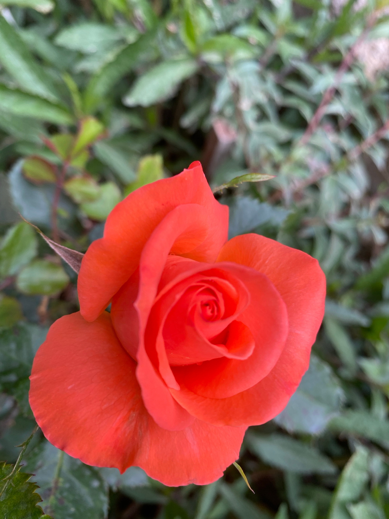 The image shows a close-up of an orange rose in full bloom. The petals are tightly spiraled in the center, gradually opening outwards. The background is a blur of green foliage. The image was likely t…read more