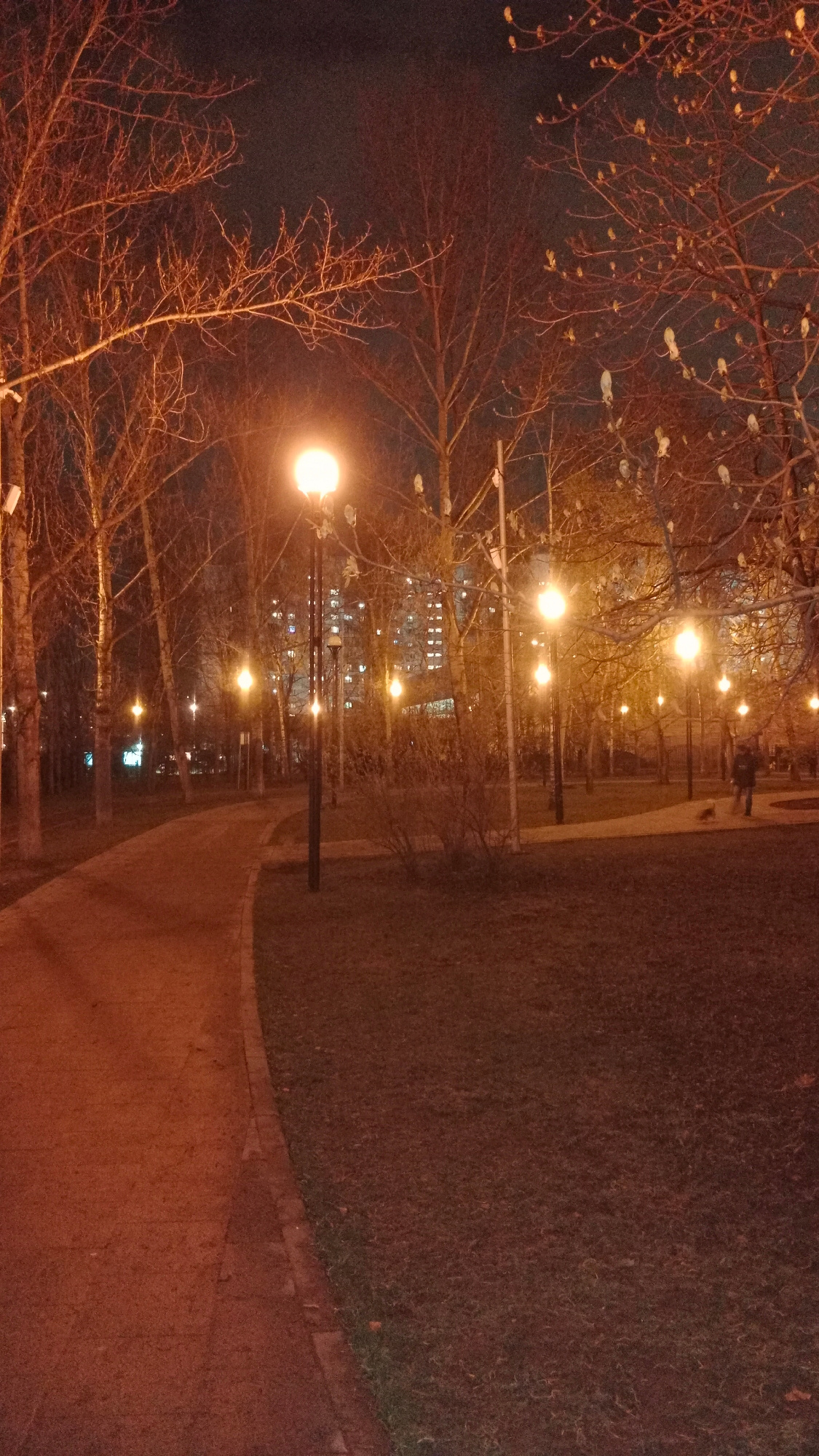 The image depicts a tranquil nighttime scene within an urban park, likely in Moscow, Russia. A wide, paved pathway curves gently from the bottom center towards the left, illuminated by a series of bri…read more