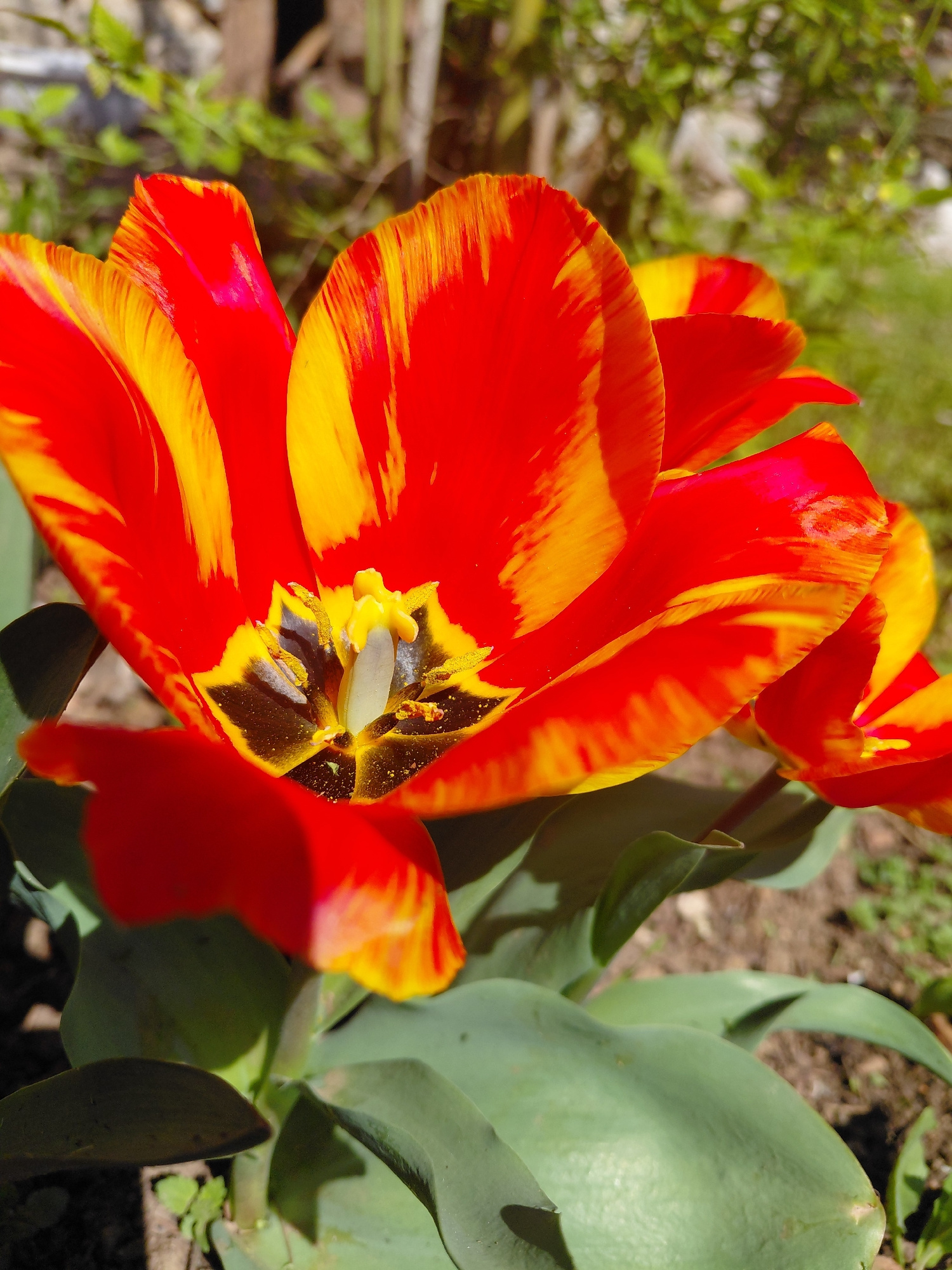 A close-up captures a vibrant, open tulip. The petals are predominantly red with streaks of yellow. The center reveals yellow and black stamens and a pistil. Green leaves surround the flower. The back…read more