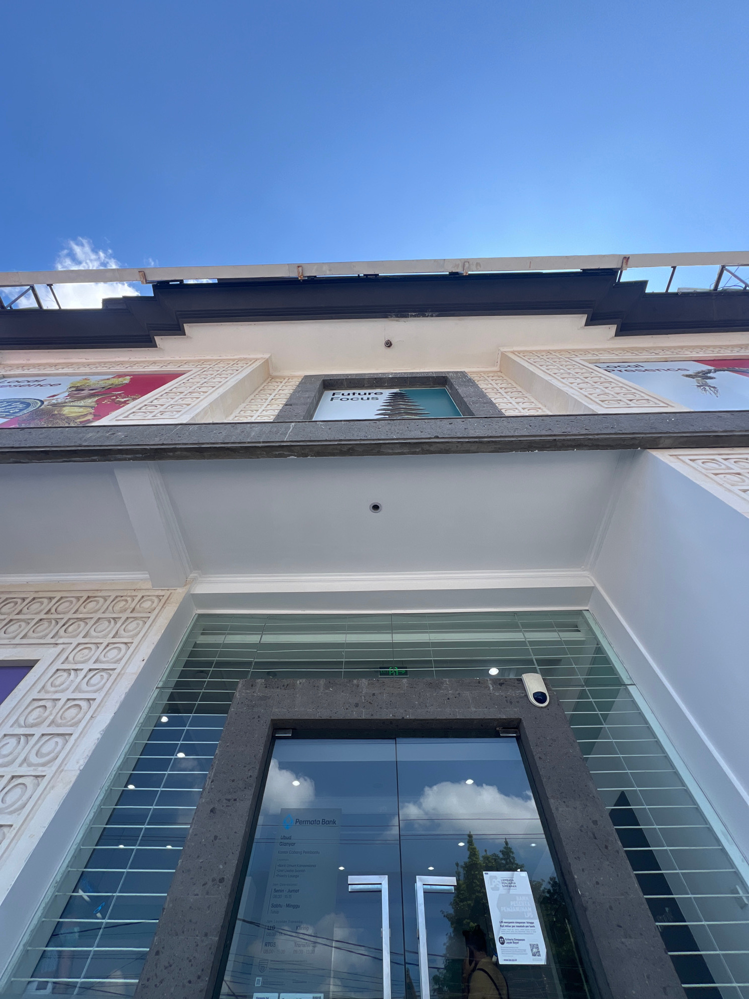 An upward-angled outdoor shot captures the facade of a building, identified as a Permata Bank branch in Ubud, Gianyar, Indonesia. The bright, clear blue sky with a few white clouds dominates the upper…read more