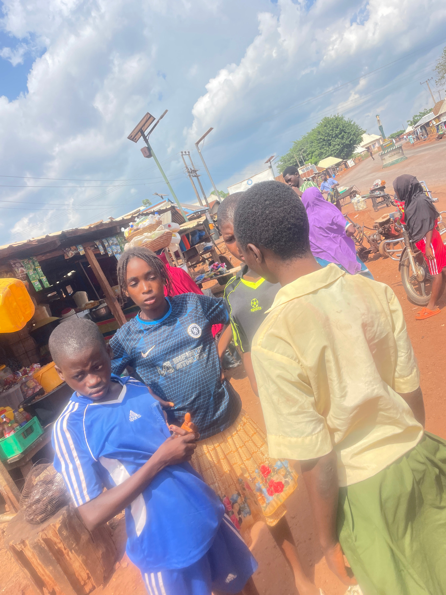 The image captures a street scene in Apunu, Nigeria, with a group of people in the foreground and market stalls along a road in the background. The foreground shows four people, three of whom are wear…read more