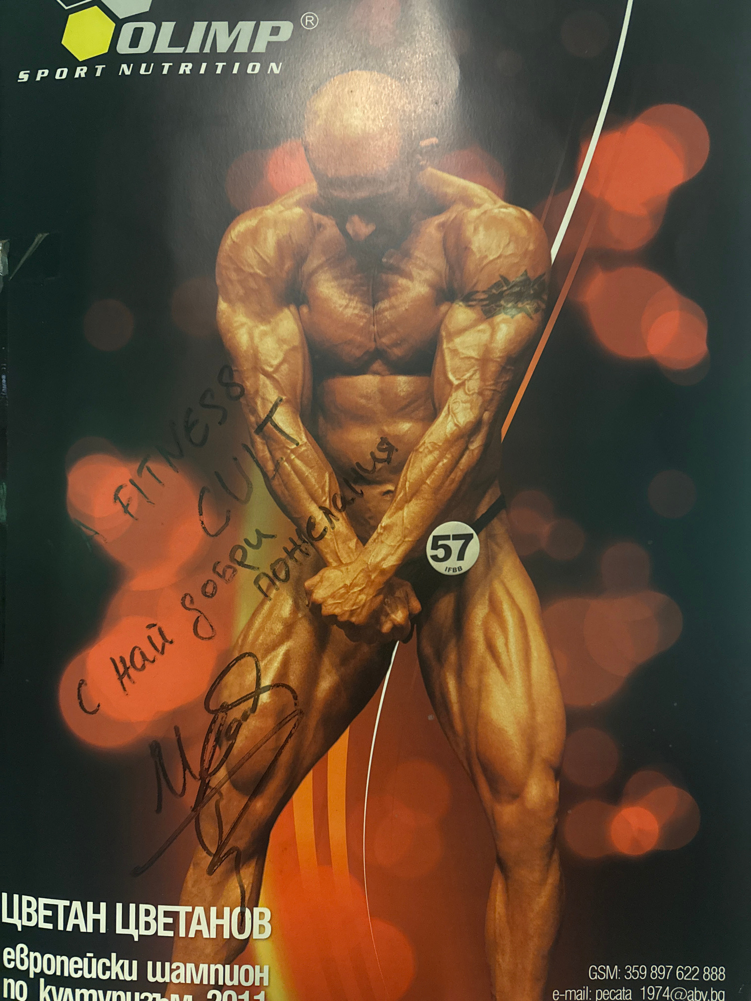A vertical promotional poster features a highly muscular male bodybuilder in a classic pose, showcasing his defined physique. He stands against a dark background illuminated by blurred orange and red…read more
