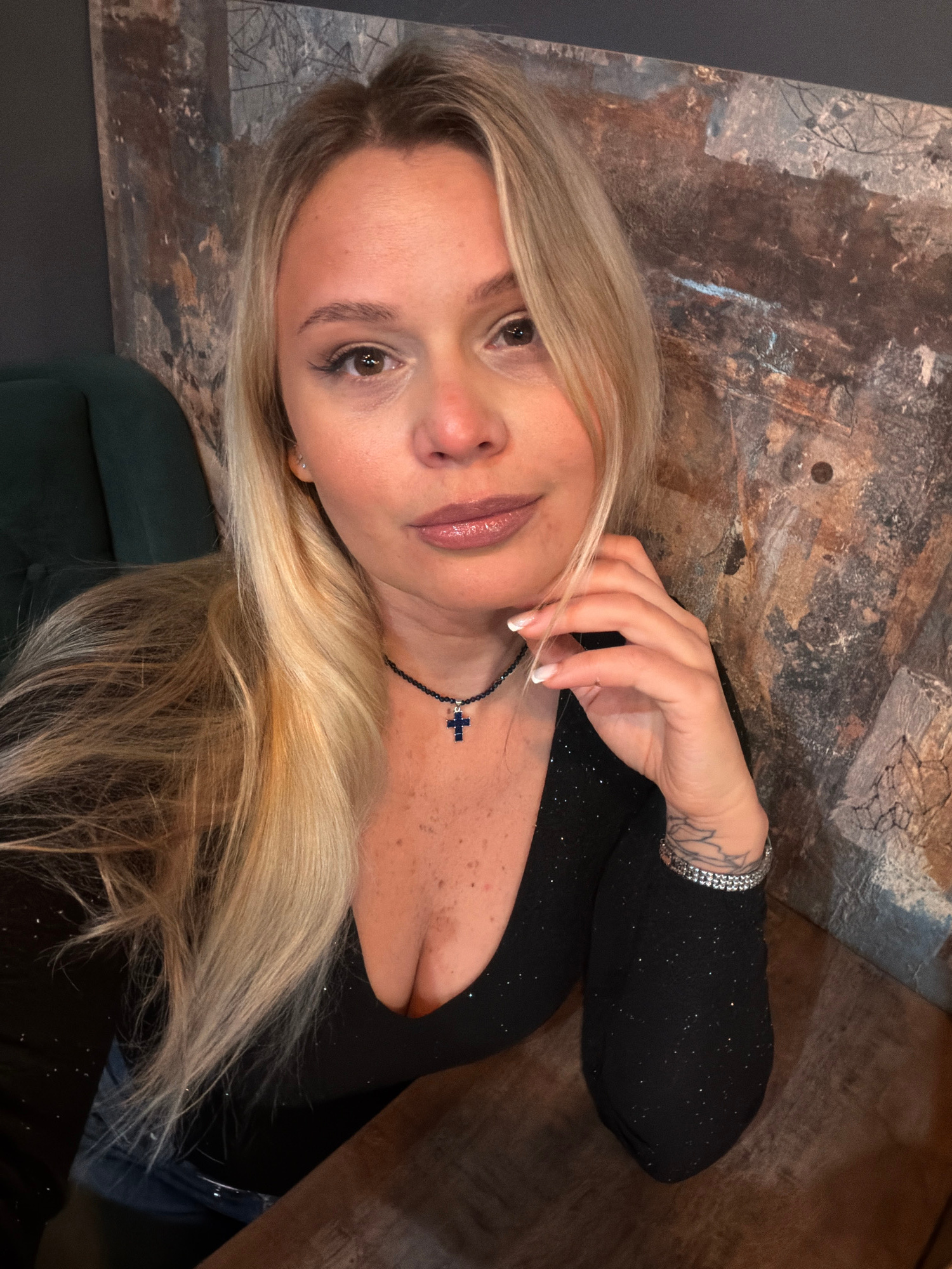 A close-up indoor portrait features a light-skinned female with long, straight blonde hair parted to her left, extending over her shoulders. She looks directly at the camera with a neutral expression.…read more