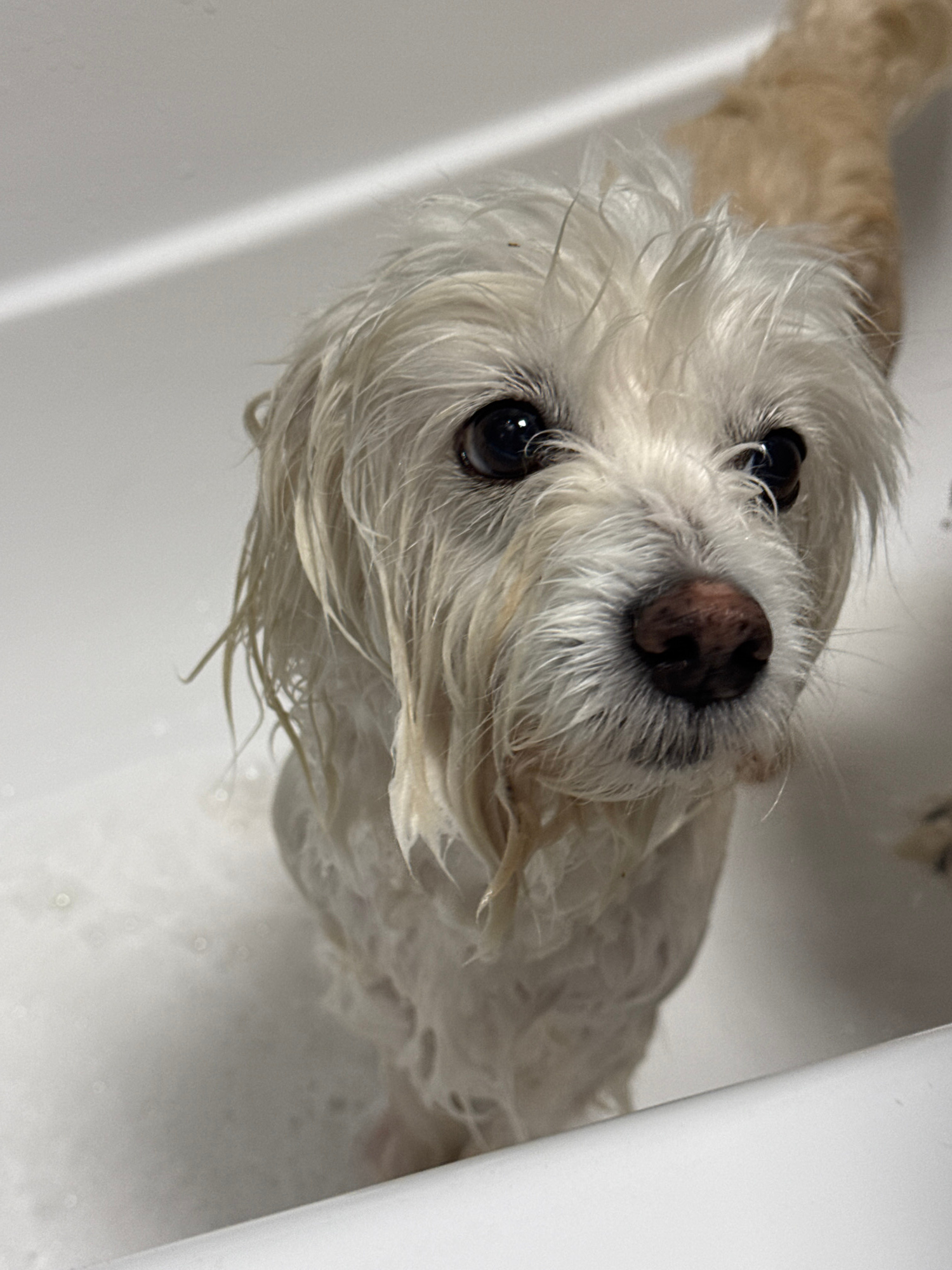 A small, light-colored dog, possibly a Maltese or similar breed, is captured during a bath in Noviy, Russia. The dog's wet, white and light brown fur, dark eyes, and dark brown nose are the central fo…read more