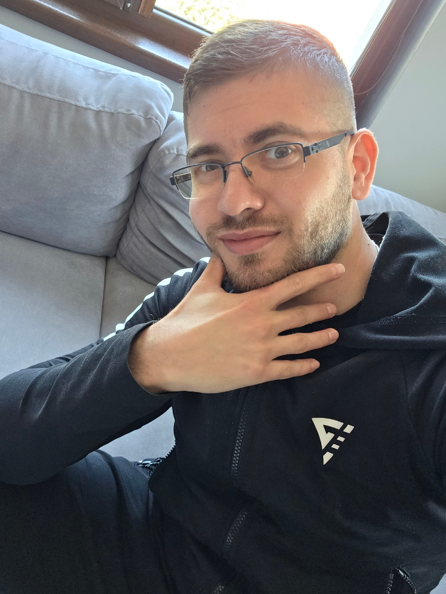 A man is lying on a gray couch. He is wearing glasses and a black jacket with a white logo. His hand is on his neck. A window with light streaming in can be seen next to the couch. No information in t…read more