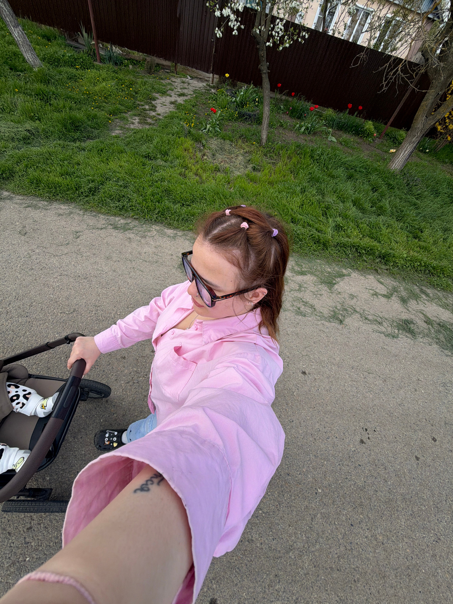 This high-angle, first-person perspective image, taken in Novopokrovskaya, Russia, captures a person walking outdoors while pushing a stroller. The individual, likely a woman, has brown hair styled wi…read more