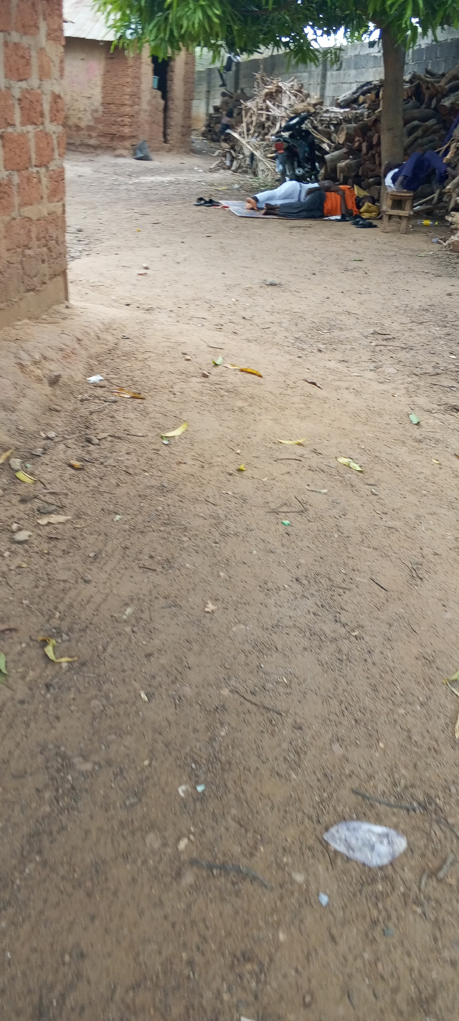 The image depicts an outdoor scene in Keffi, Nigeria. The foreground is dominated by a dirt ground scattered with leaves and litter. In the background, several people are near a pile of firewood next…read more