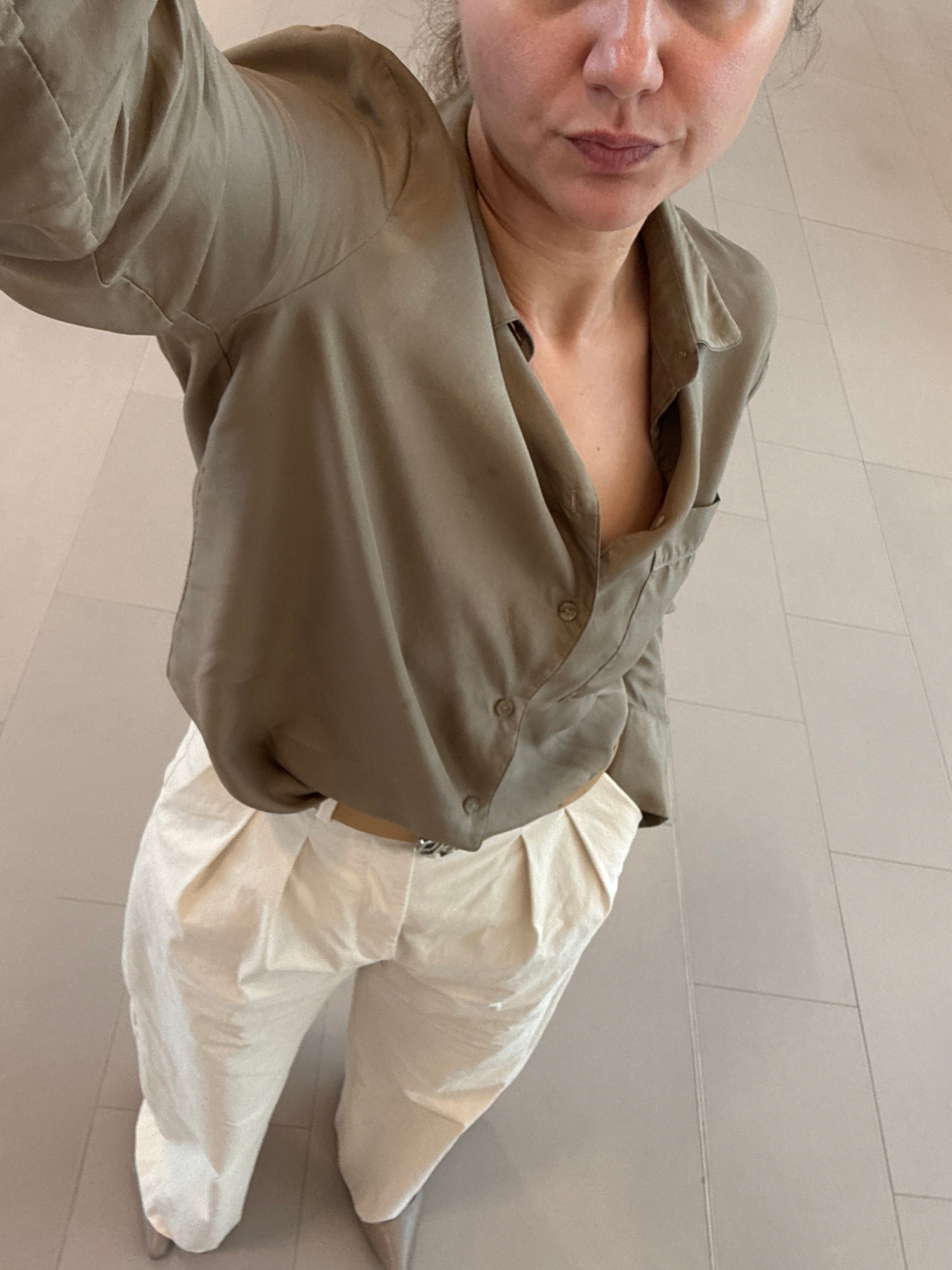 A person wearing beige pants and an olive-green button-down shirt stands indoors on a light-colored tiled floor. The person's face, neck, and upper chest are visible. The scene appears to be a selfie…read more