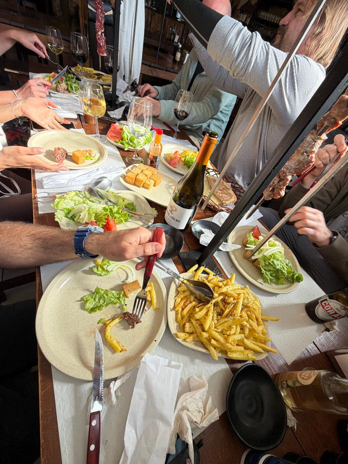A table laden with food at an angled view displays an assortment of dishes including french fries, lettuce salads, meat skewers, and bread. Diners' hands are visible, reaching for and manipulating theβ¦read more