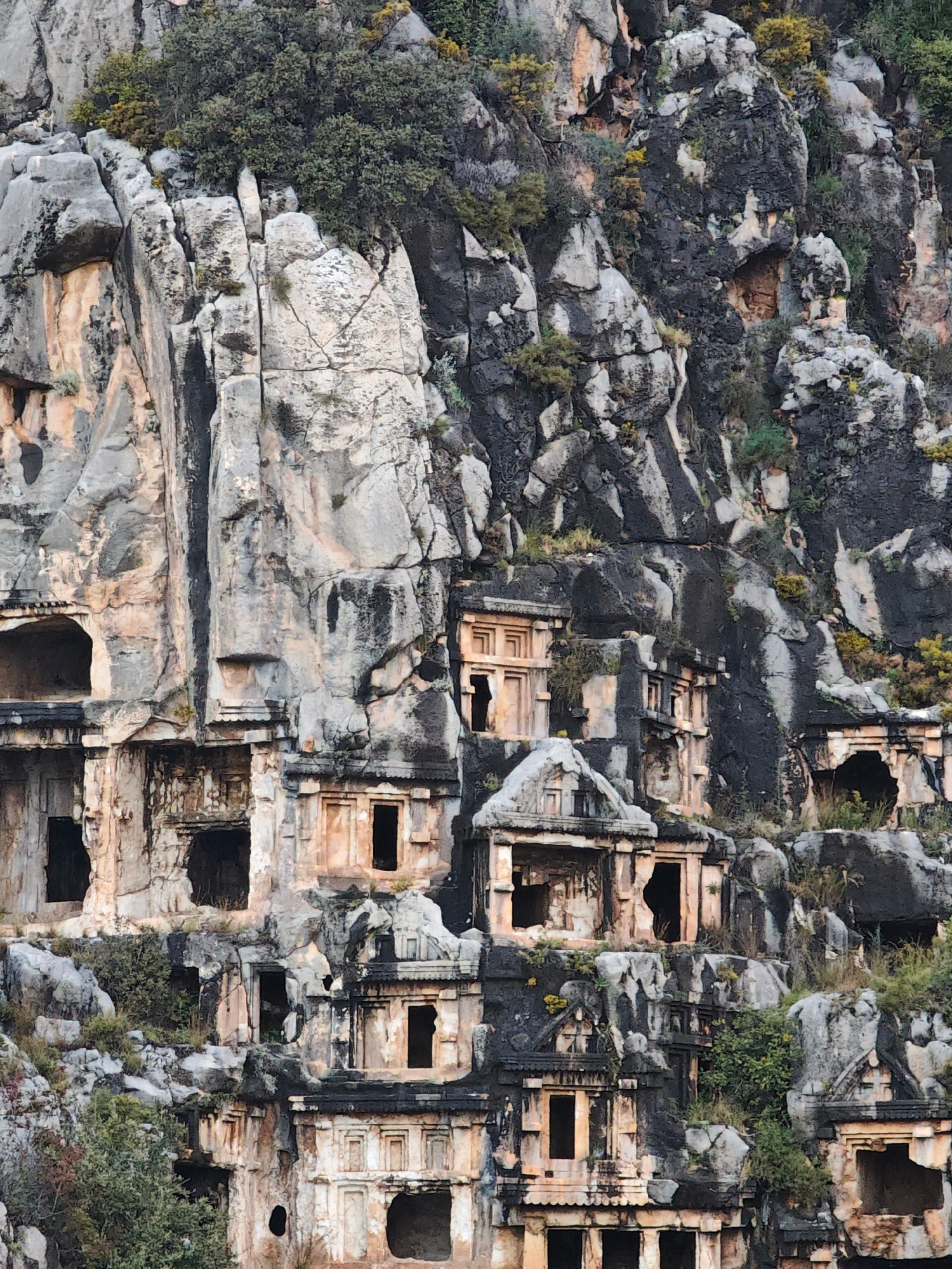 The image depicts the Lycian rock-cut tombs in the ancient city of Myra, located in present-day Demre, Turkey. The tombs are carved directly into the cliff face and are arranged in tiers. The architec…read more