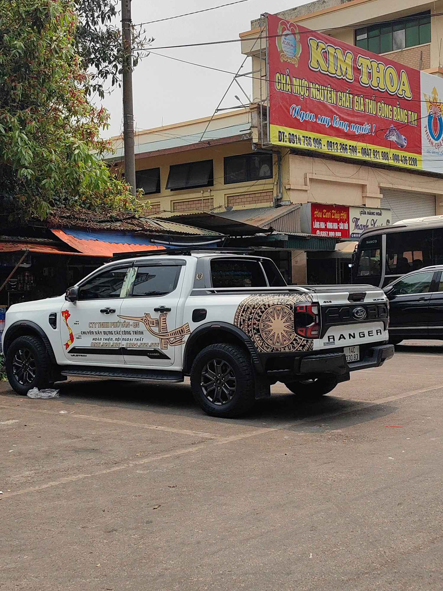 The image shows a white Ford Ranger pickup truck parked on a paved surface in Hong Gai Ward, Vietnam. The truck features unique decorative decals, including a depiction of the Vietnamese map and a sty…read more