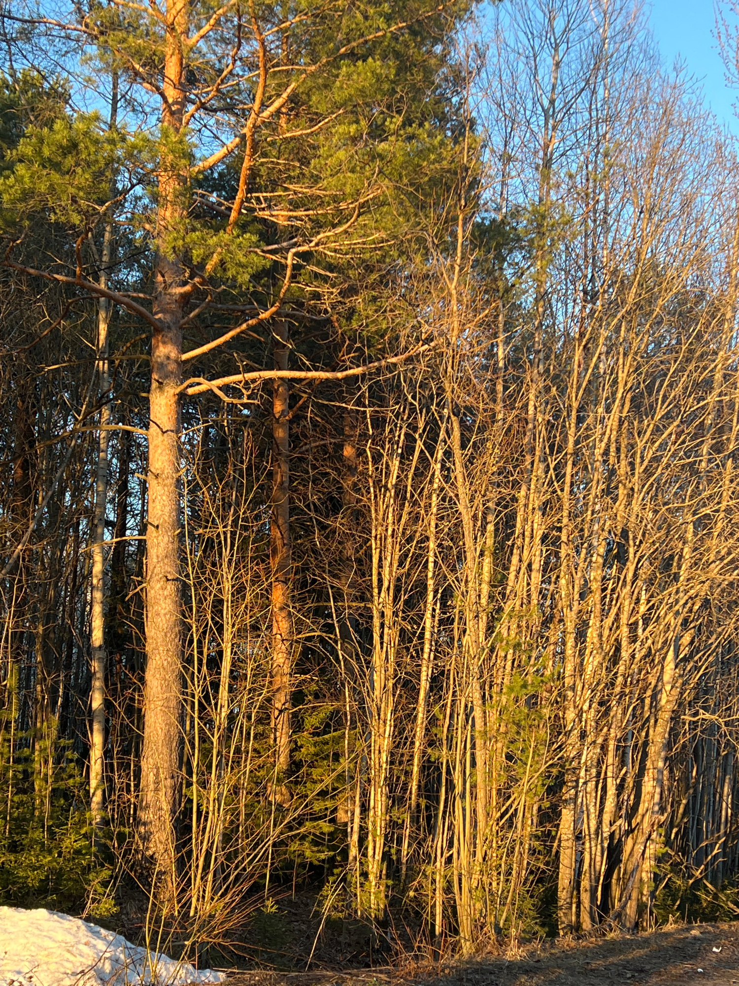 The image depicts a forest or wooded area, likely in Berezniki, Russia. There's a mix of evergreen and deciduous trees. Some trees are full with green foliage, while others have bare branches suggesting it could be late autumn or winter. Sunlight is prominent, casting shadows and highlighting textures of tree bark and branches. Snow is visible in the lower right portion of the image. No people, subjects, objects, actions, or interactions are directly visible beyond the trees themselves. | Open Wire