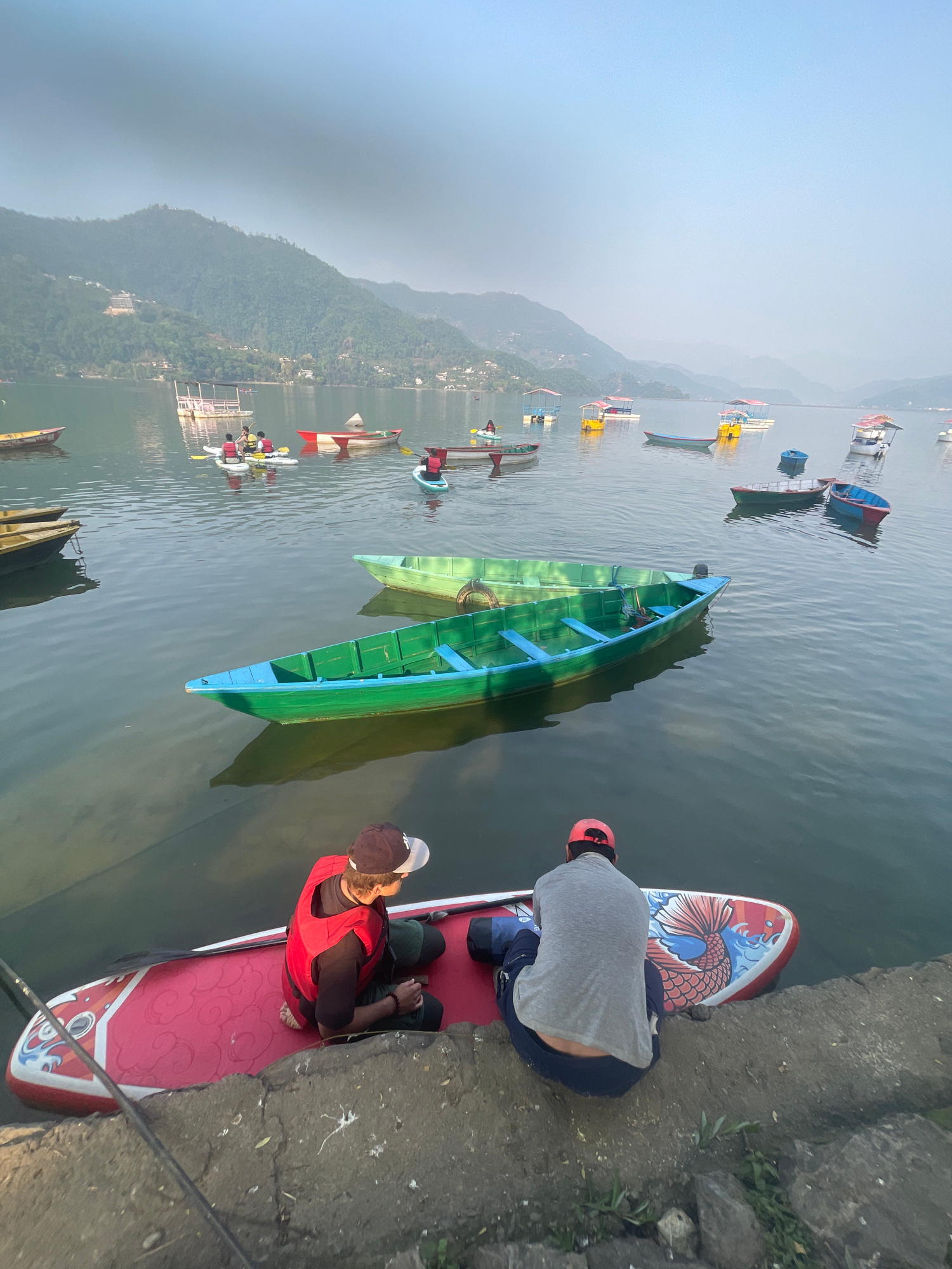 The image depicts a waterfront scene in Pokhara, Nepal. The foreground features two individuals sitting on paddleboards adjacent to a concrete embankment. One person is wearing a red life vest and a b…read more