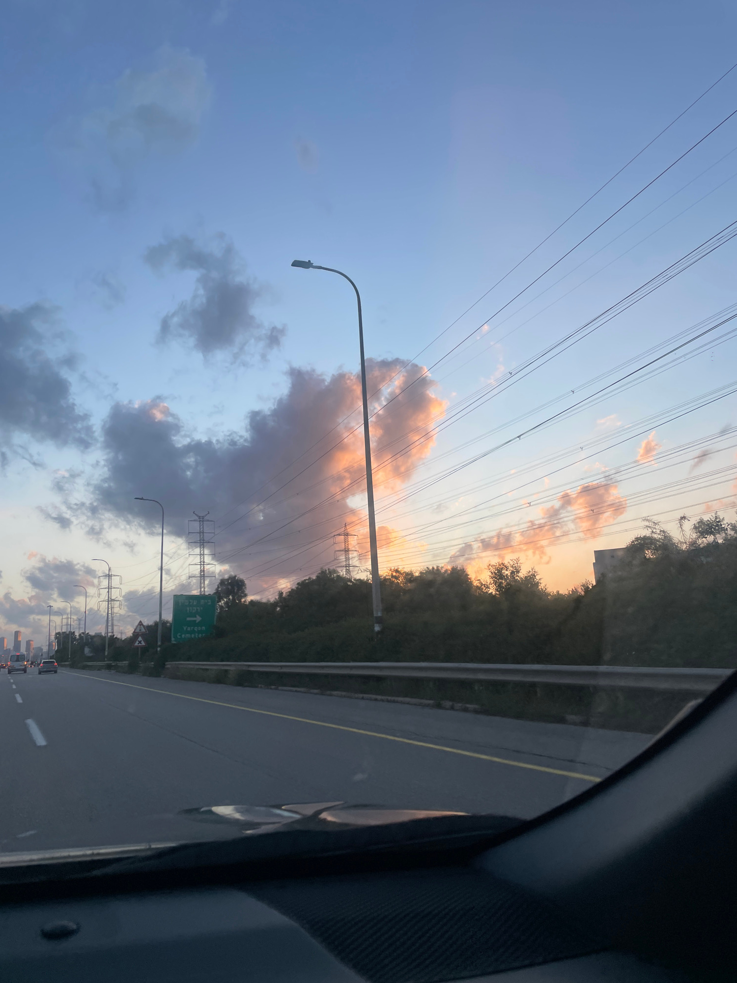 The image captures a scene from a vehicle traveling along a highway in Petah Tikva, Israel, during dusk or dawn. The sky is visible, featuring a mix of blue and orange hues with scattered clouds. Over…read more