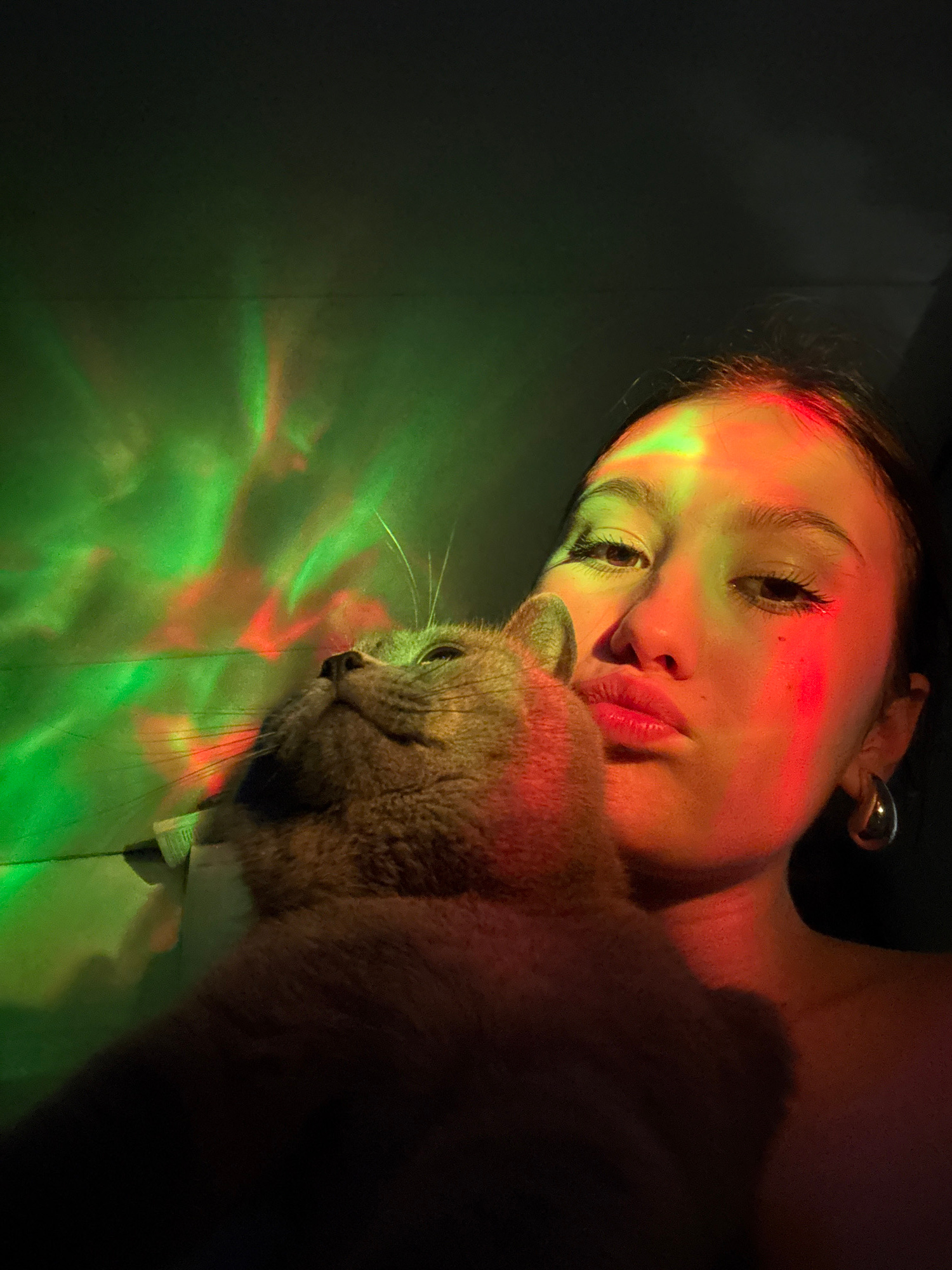 A woman lies next to a cat on a flat surface, likely a bed or floor, bathed in a mix of green and red light. The woman is light-skinned and has dark hair pulled back, with a metal earring visible. Her…read more