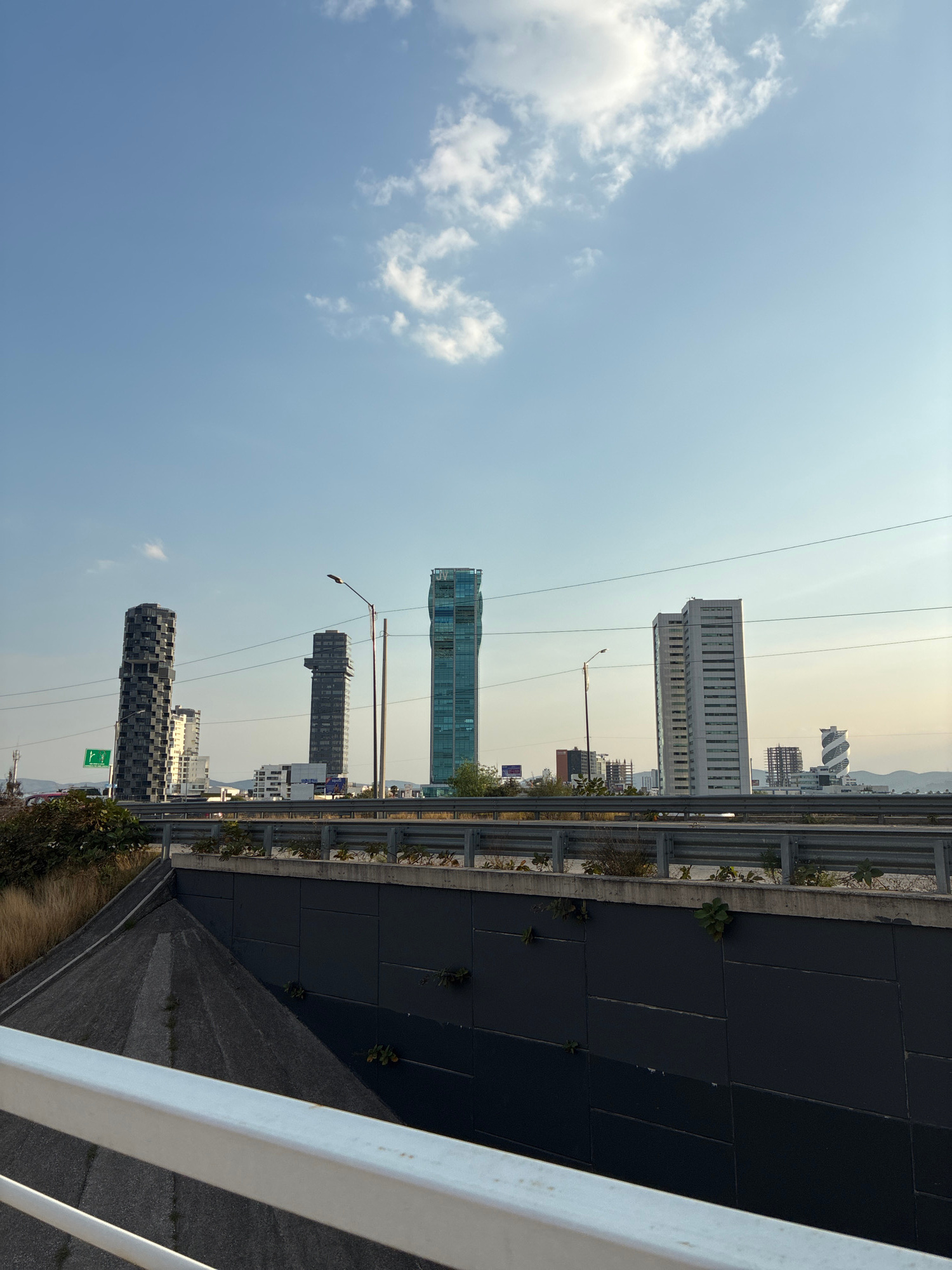 The image shows a view from an elevated position, likely a bridge or overpass, overlooking a cityscape. Several tall buildings are visible in the distance. The sky is light blue with scattered clouds.…read more