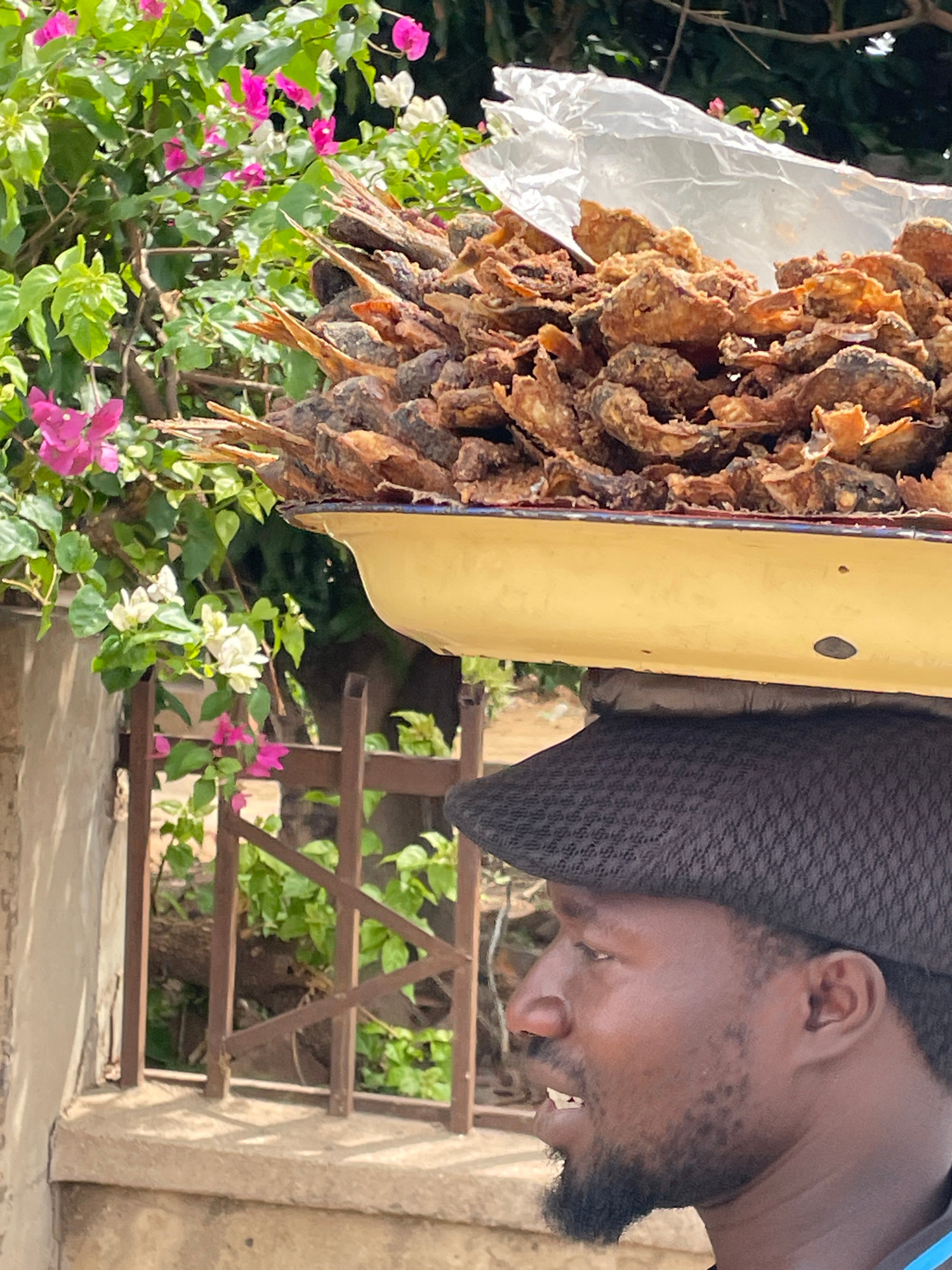 A man stands by a yellow vendor's cart laden with a large quantity of fried fish, likely for sale. The cart is surrounded by bougainvillea plants with pink and white flowers. In the background, a rust…read more