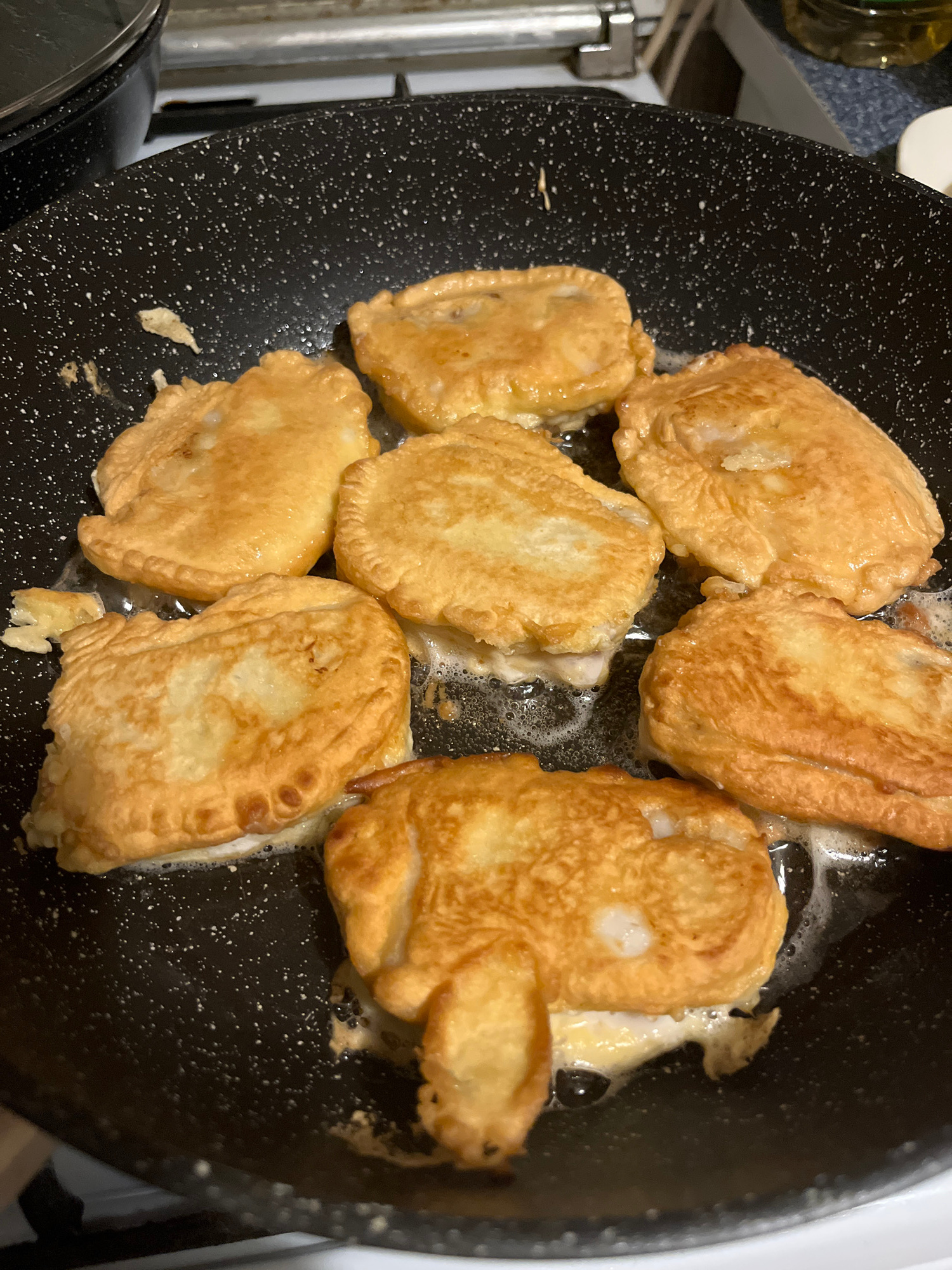 The image displays a close-up, overhead view of several golden-brown food items being cooked in a black non-stick frying pan. Approximately seven to eight pieces of food are visible, each with an irre…read more