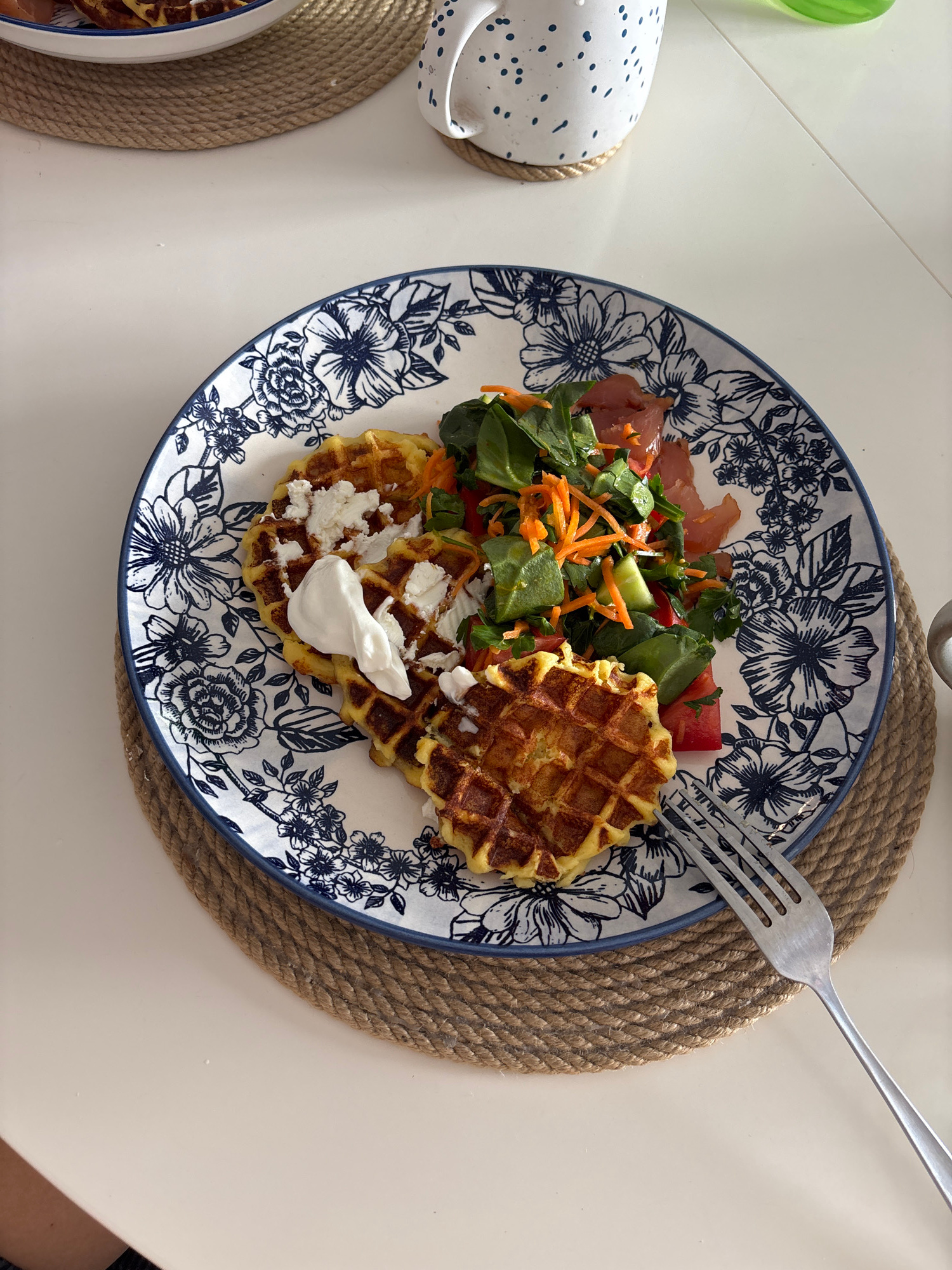 This overhead shot captures a well-composed savory meal served on a light-colored, likely white, tabletop. The central subject is a round ceramic plate, featuring an intricate blue and white floral pa…read more