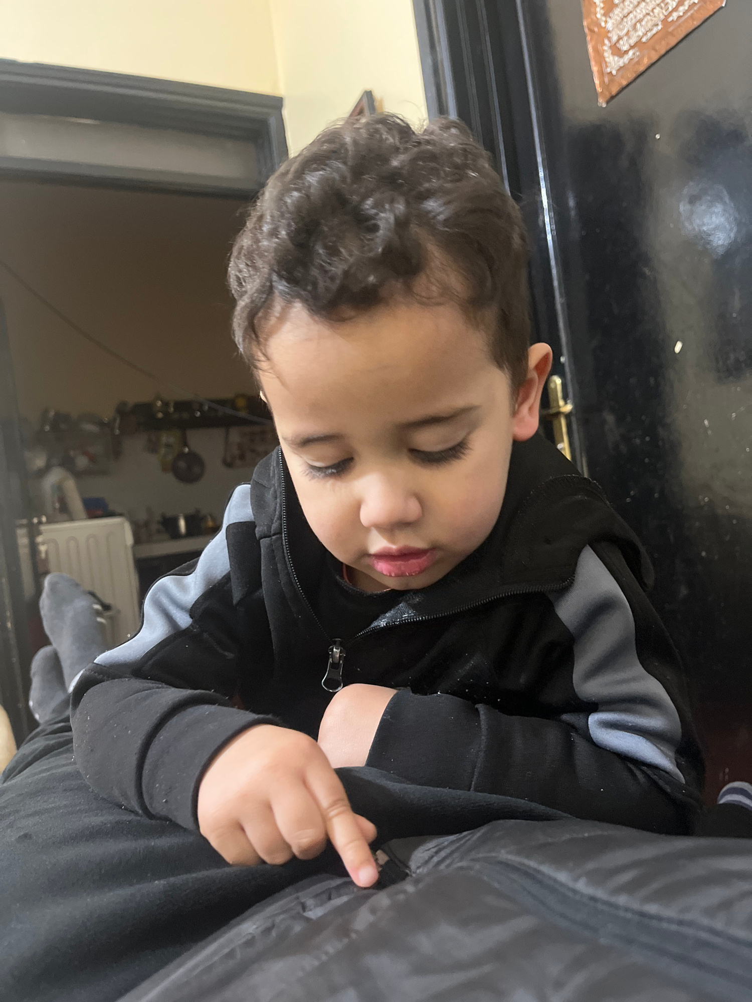 The image depicts an indoor scene in a residential setting in Ouaouizert, Morocco. A young child, approximately 2-4 years of age, with dark, curly hair and light complexion, is positioned in the foreg…read more