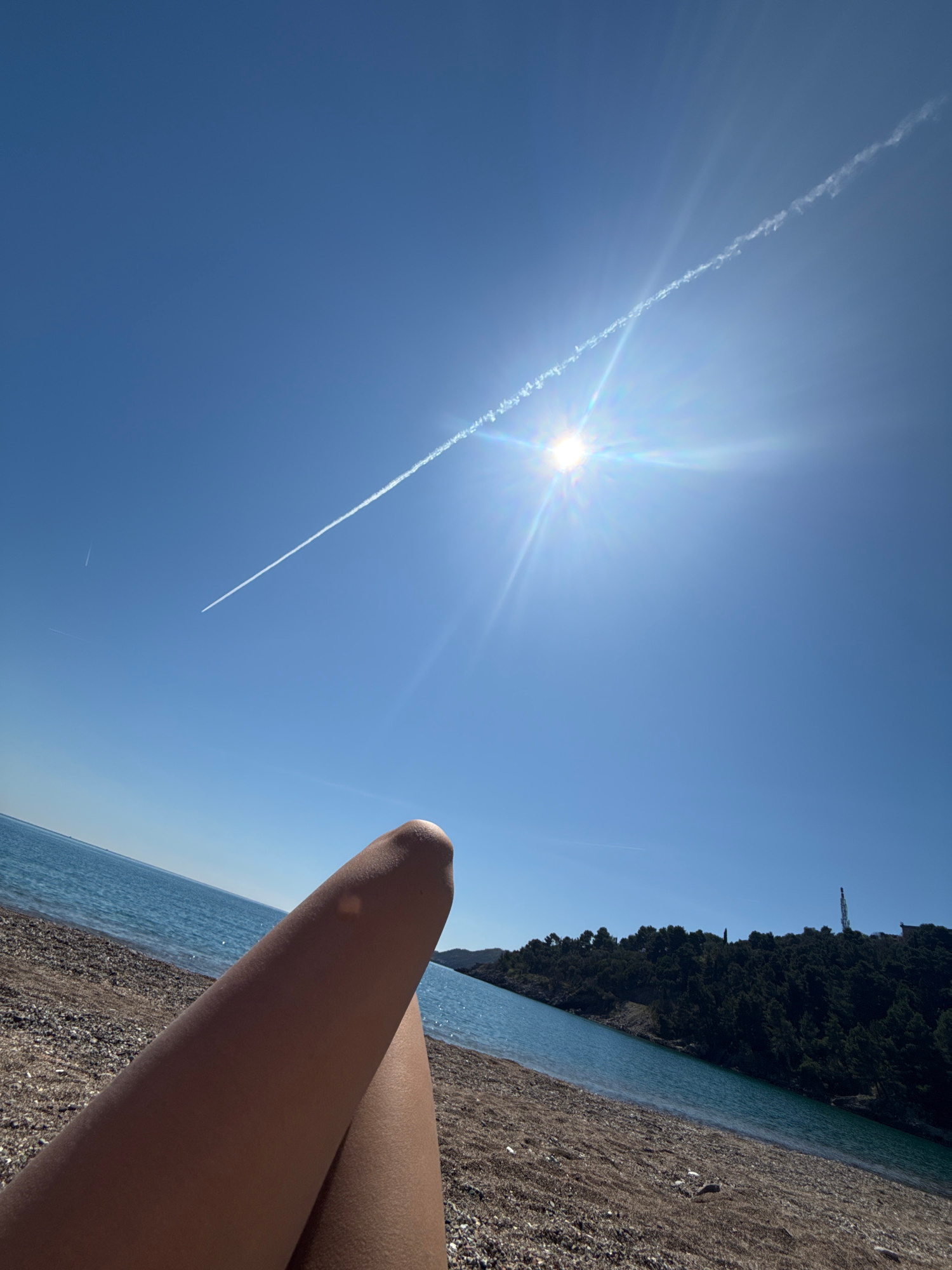 The image shows a sunny day at a beach. The sky is a clear blue with the sun shining brightly and a contrail visible. The beach appears to be pebbly, with the water's edge visible. Part of a person's…read more