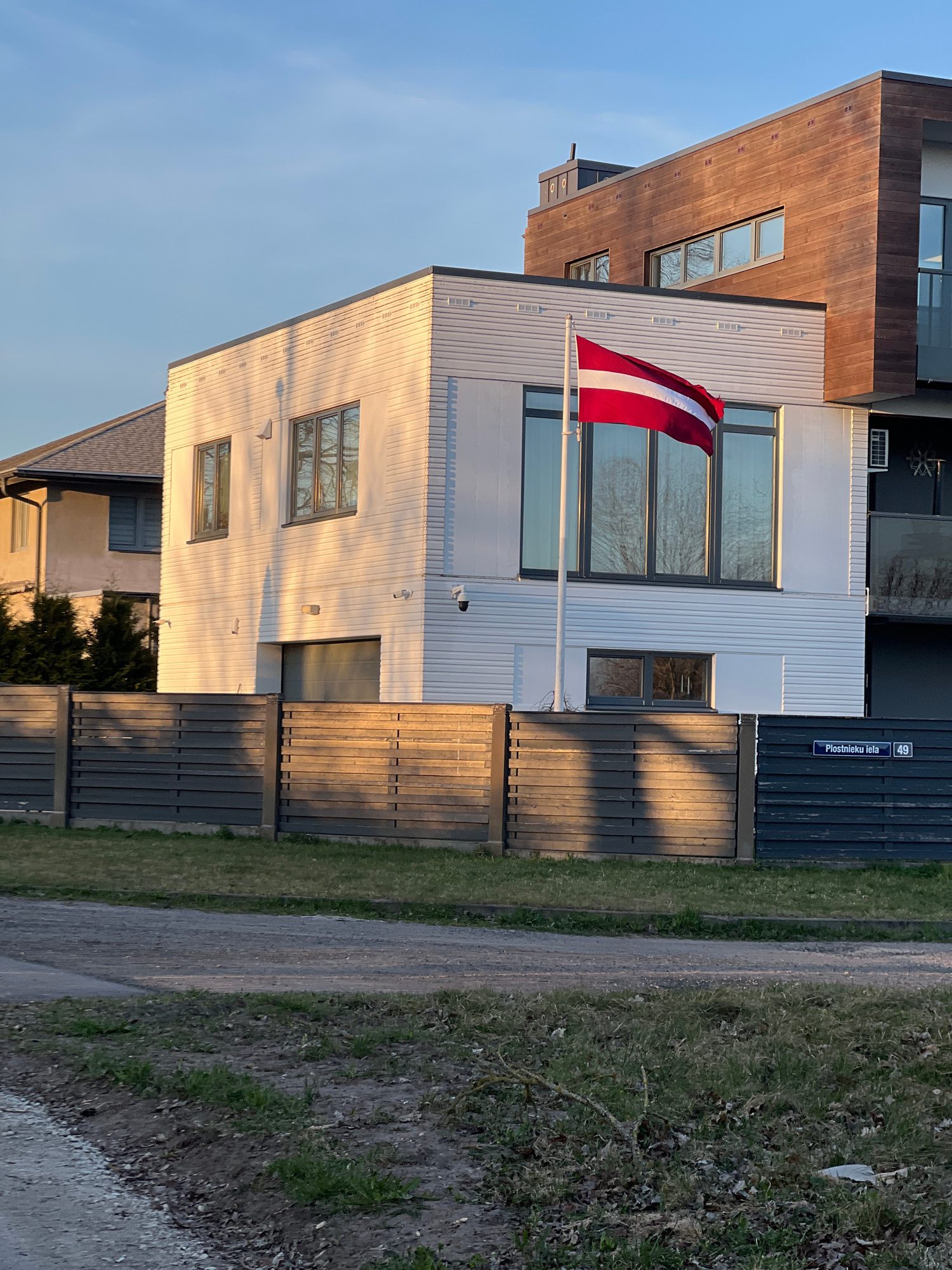 The image shows a modern building in Riga, Latvia, identified by a street sign reading "Plostnieku iela 49." A Latvian flag is prominently displayed on a flagpole attached to the building. The buildin…read more