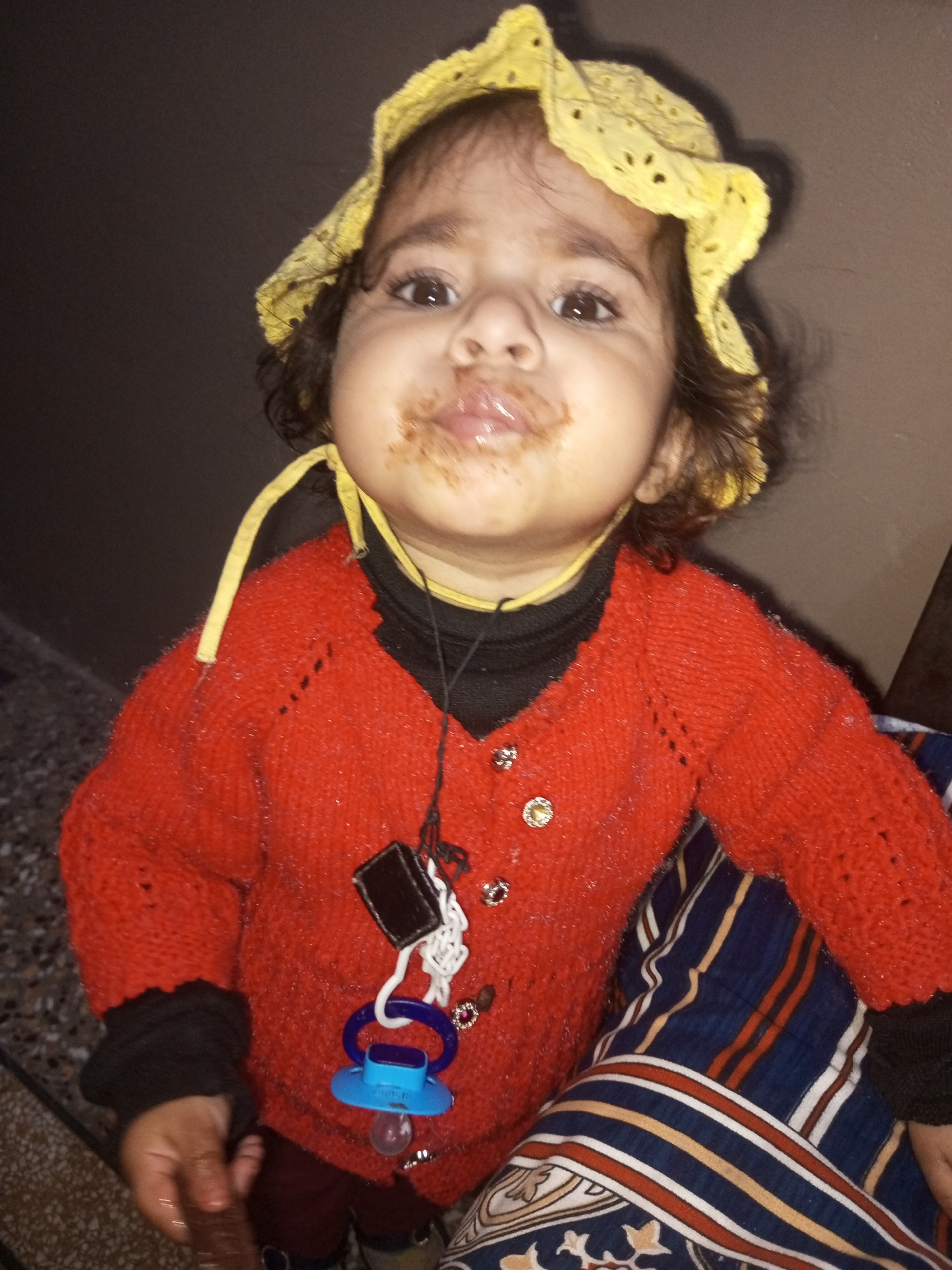 A toddler stands in what appears to be an indoor setting, likely a home, given the presence of a wall and bedding with a navy, white, and beige striped pattern. The child has a soiled mouth, possibly…read more