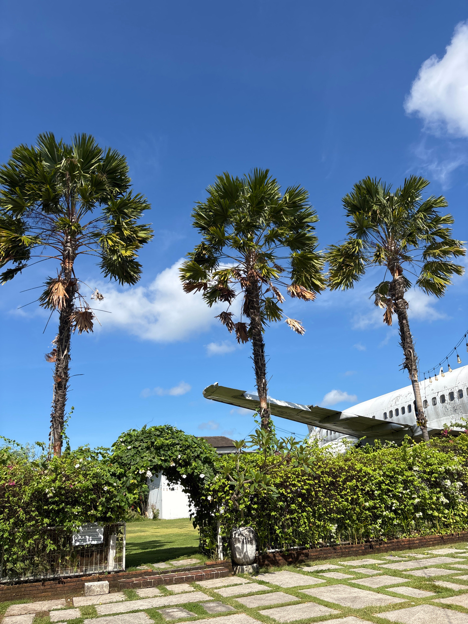 The scene is an outdoor setting in Kuta, Indonesia, under a partly cloudy blue sky. Three tall palm trees with fan-shaped leaves reach upwards. A portion of what appears to be a decommissioned airplan…read more