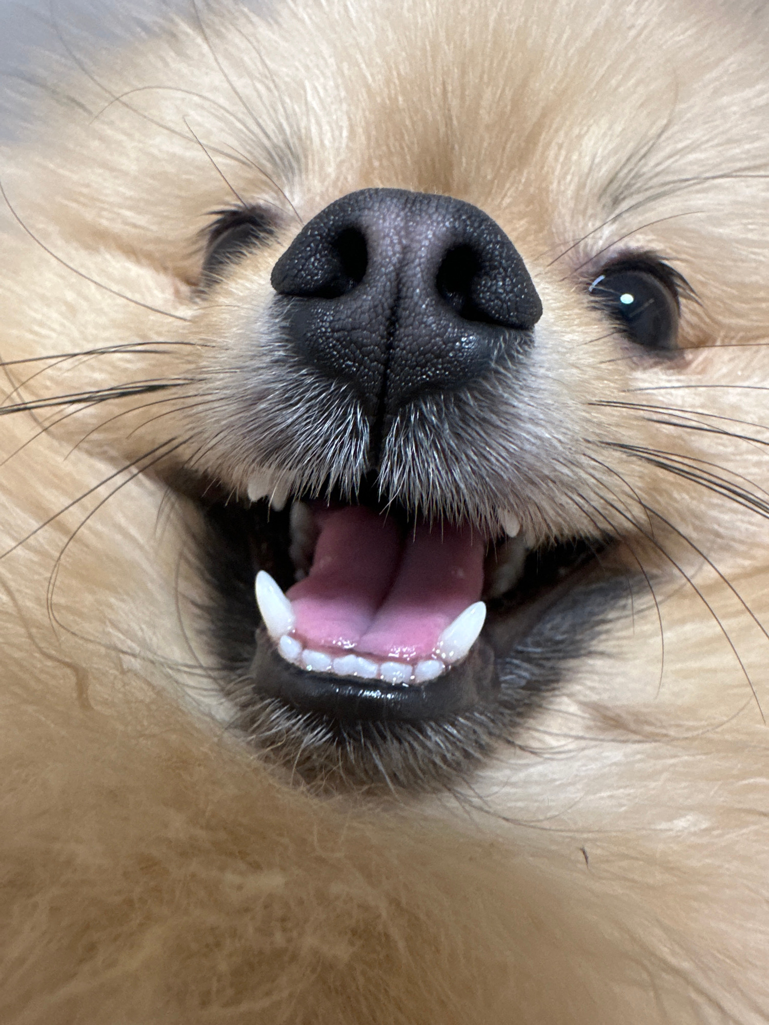 A close-up shot of a light-brown dog's face, taken from a low angle. The dog's black nose is prominently centered. Its mouth is open, revealing its pink tongue and white teeth. Long, dark whiskers are…read more