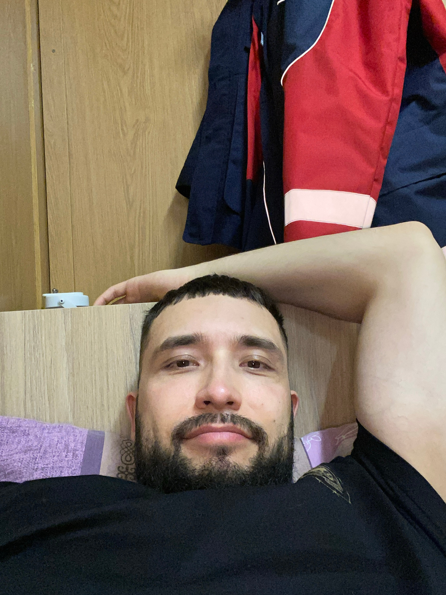 The image captures a man lying down and looking directly at the camera with a gentle, relaxed smile. He has short dark hair, dark eyebrows, and a neatly trimmed dark beard and mustache. A small, intriβ¦read more