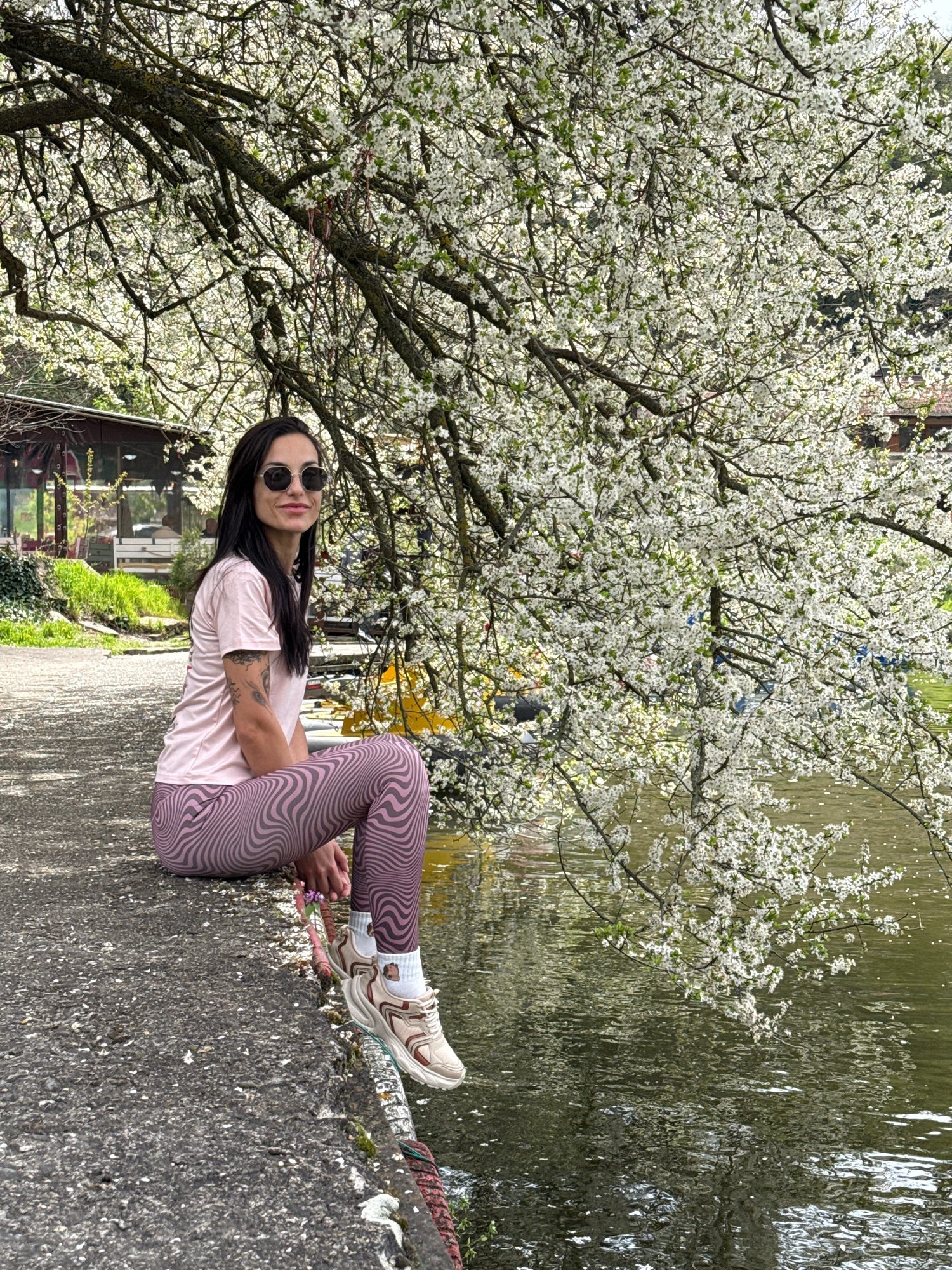 A woman is sitting on a concrete edge near water, under a tree covered in white blossoms. She is wearing sunglasses, a light pink t-shirt, and patterned leggings. Her sneakers are visible, and a tatto…read more