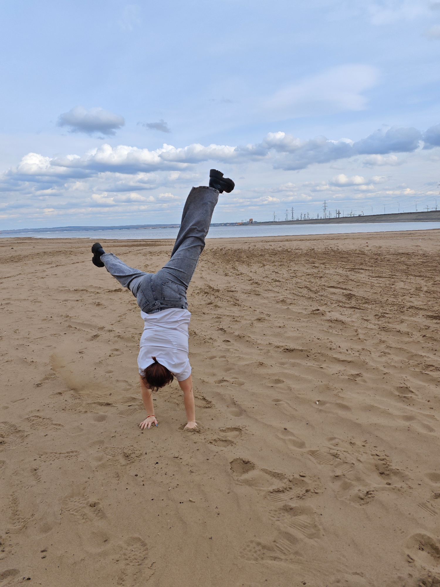 A person is doing a handstand on a sandy beach. The person is wearing a white t-shirt, gray jeans, and black shoes. The beach is near water, and in the distance, there are power lines and industrial s…read more
