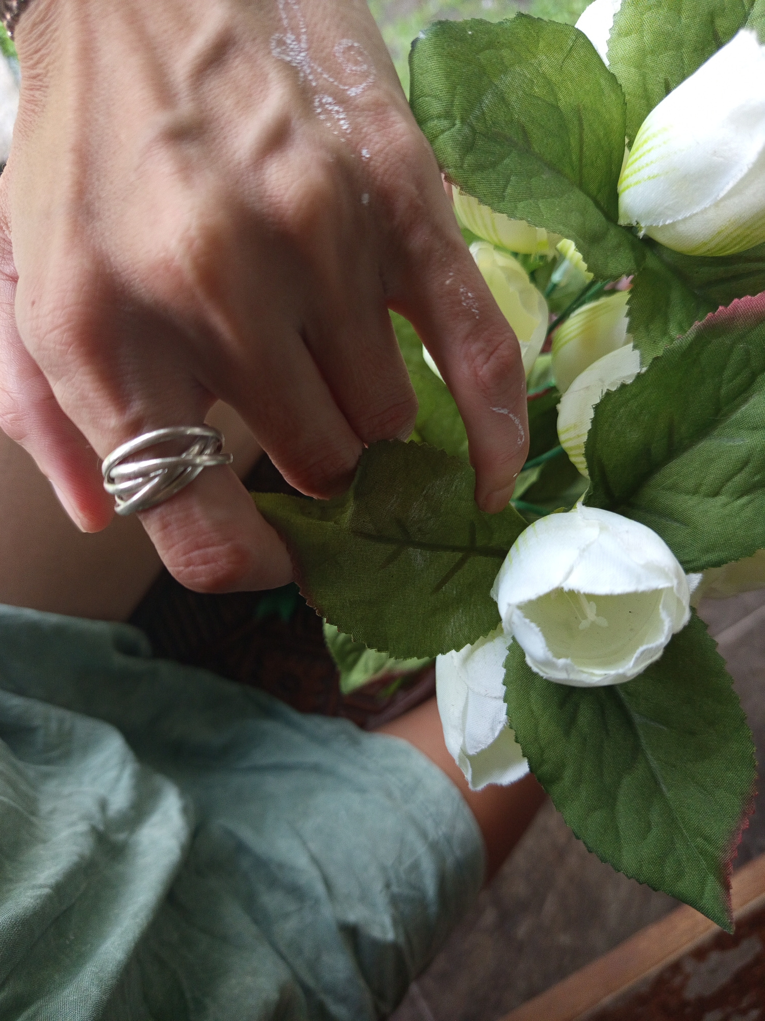 A close-up, high-angle photograph captures a person's hand gently interacting with an arrangement of white and green flowers. The hand, with light skin tone, features faint white decorative lettering…read more