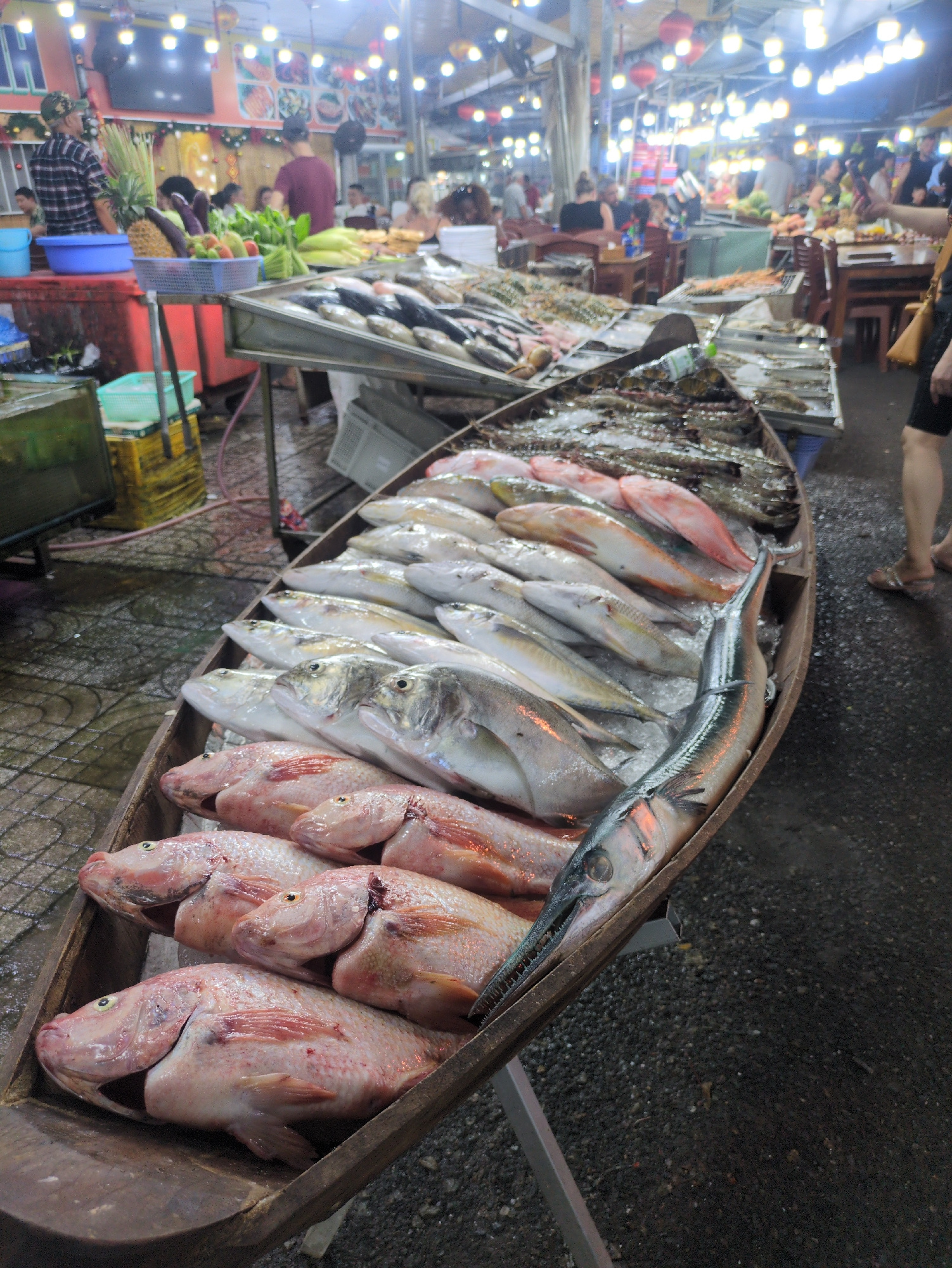 The image depicts a fish market in Phú Quốc, Vietnam. Various types of fish, including red tilapia, are displayed on ice in a wooden boat-shaped container for sale. Behind the fish display, there are…read more