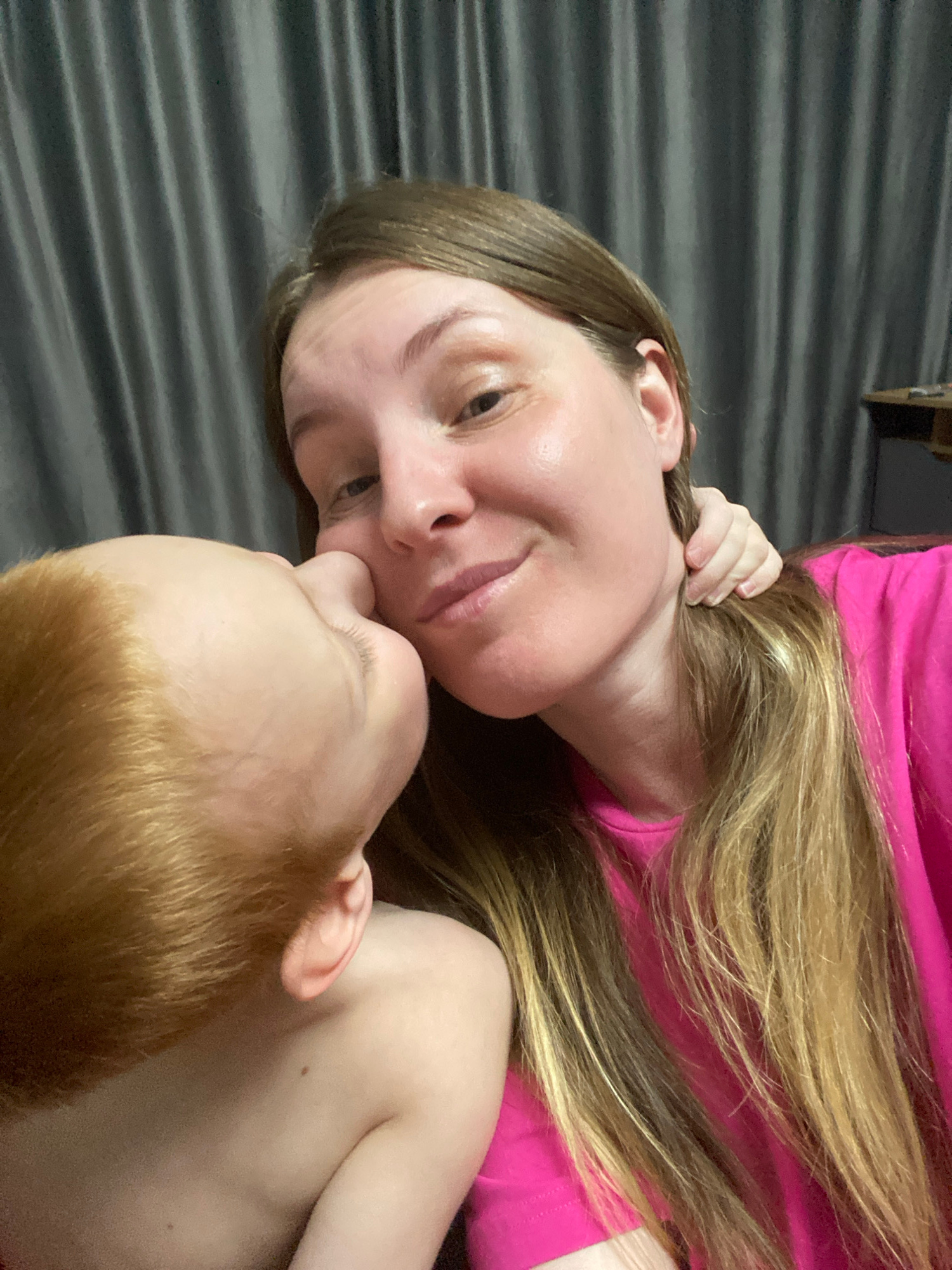 A photograph depicts a woman and a young child, possibly lying down. The woman has light skin, long blonde and brown hair, and is wearing a pink shirt. The child, with light skin and reddish-blonde ha…read more
