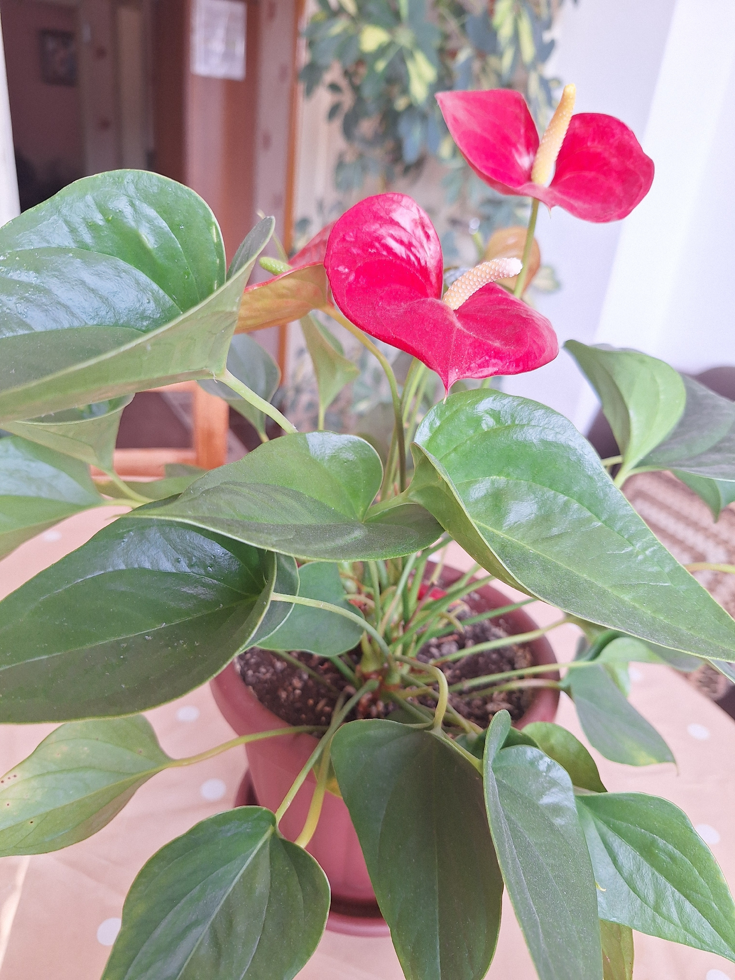 An overhead view captures a vibrant Anthurium plant, commonly known as the flamingo flower, thriving in an indoor setting in Montana, Bulgaria. The plant is housed in a round, dark brown ceramic pot,…read more