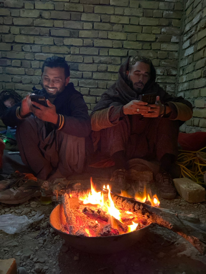 This image depicts three individuals gathered around a small fire in Kandahar, Afghanistan, within a dimly lit, semi-enclosed space characterized by an unplastered brick wall and a dirt/gravel floor.…read more