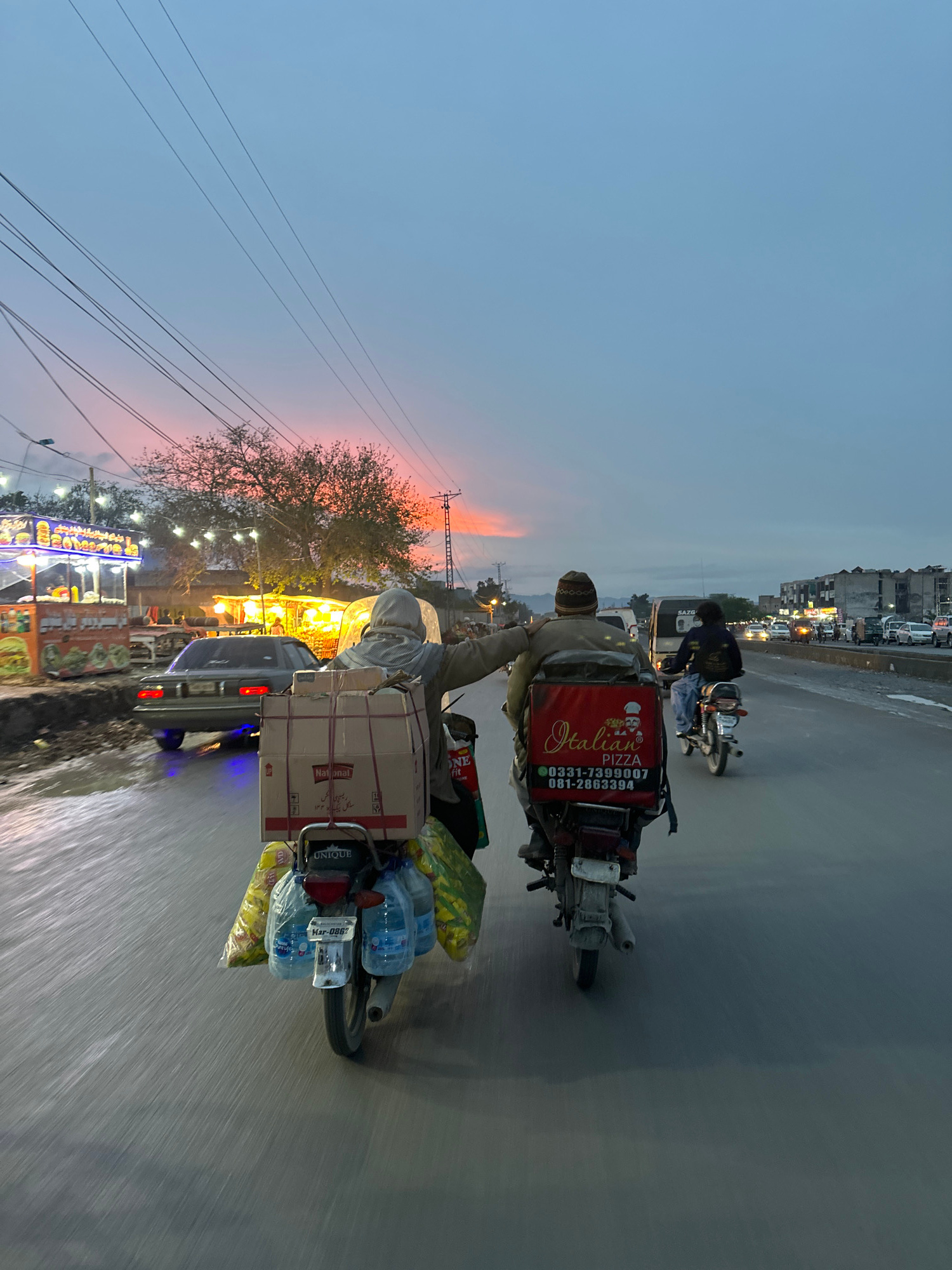 The image depicts a street scene in Quetta City Tehsil, Pakistan at dusk. The sky is a gradient of blue and orange, with buildings visible in the background. In the foreground, two motorcycles are tra…read more