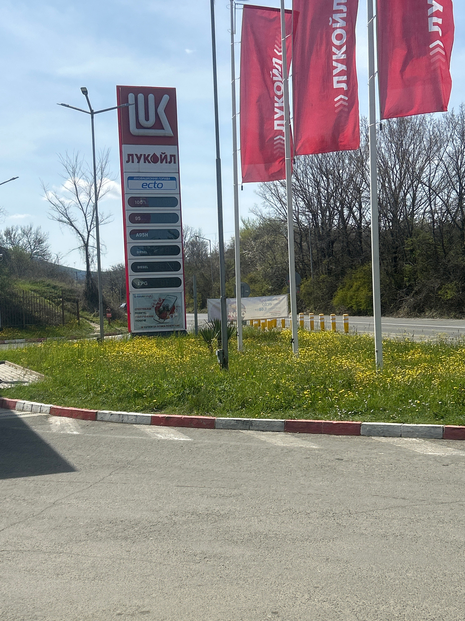 The image shows a Lukoil gas station. A price sign next to a road shows the prices for gasoline, diesel, and LPG. Red Lukoil flags are visible in the background. There is green vegetation along the ed…read more