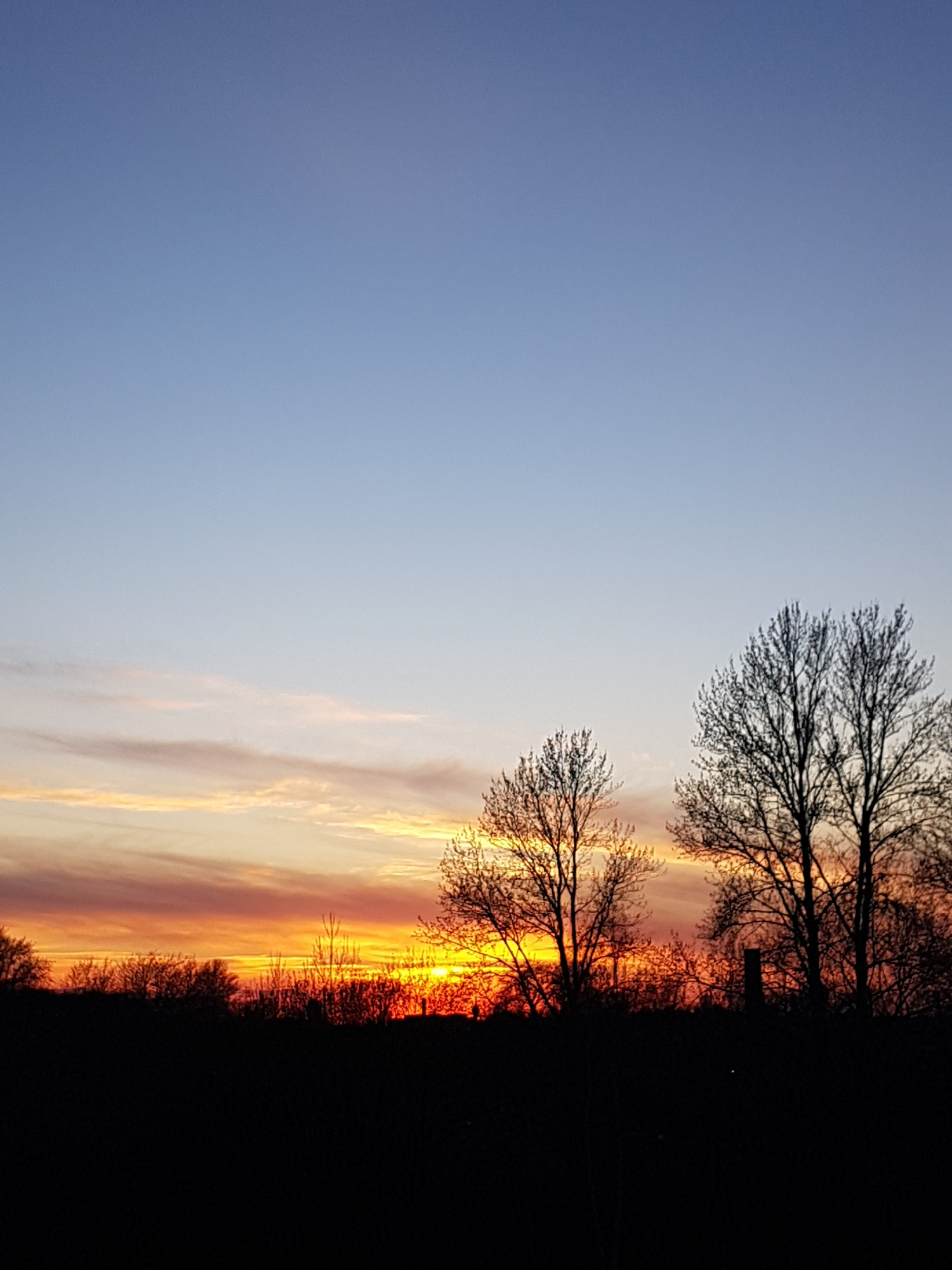 The image depicts a sunset scene. The sky transitions from blue on the left to orange and yellow hues near the horizon on the right. Silhouetted trees are visible along the right edge of the image, ob…read more