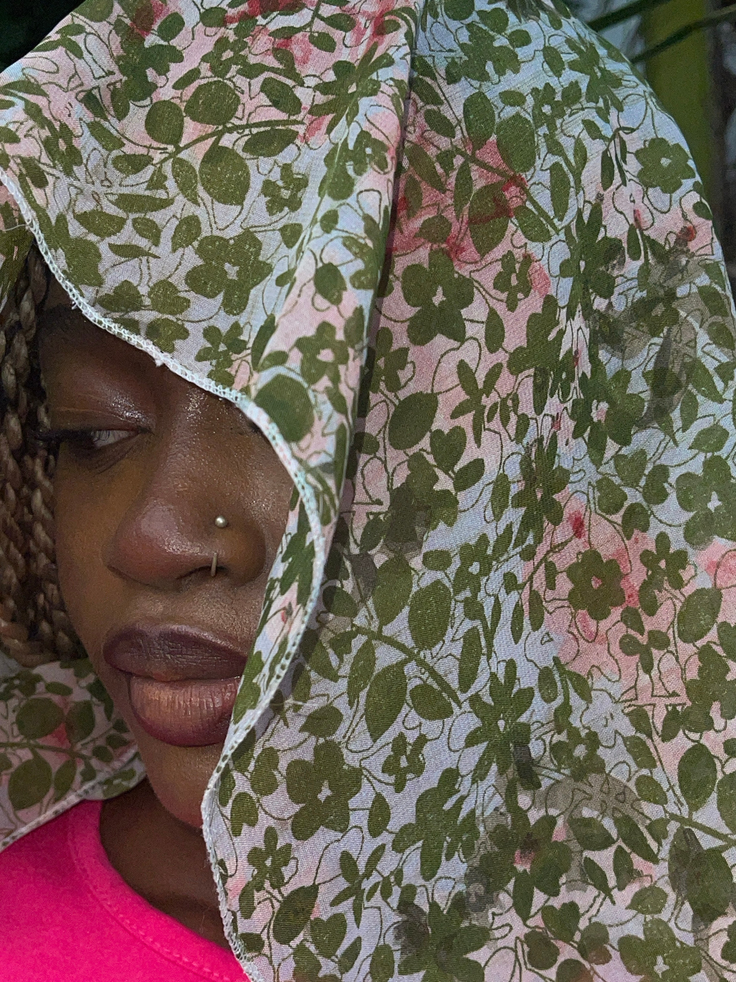 A close-up, angled shot captures the lower portion of a person's face, partially obscured by a floral-patterned head covering. The person has dark skin, and a small, silver stud pierces their left nos…read more