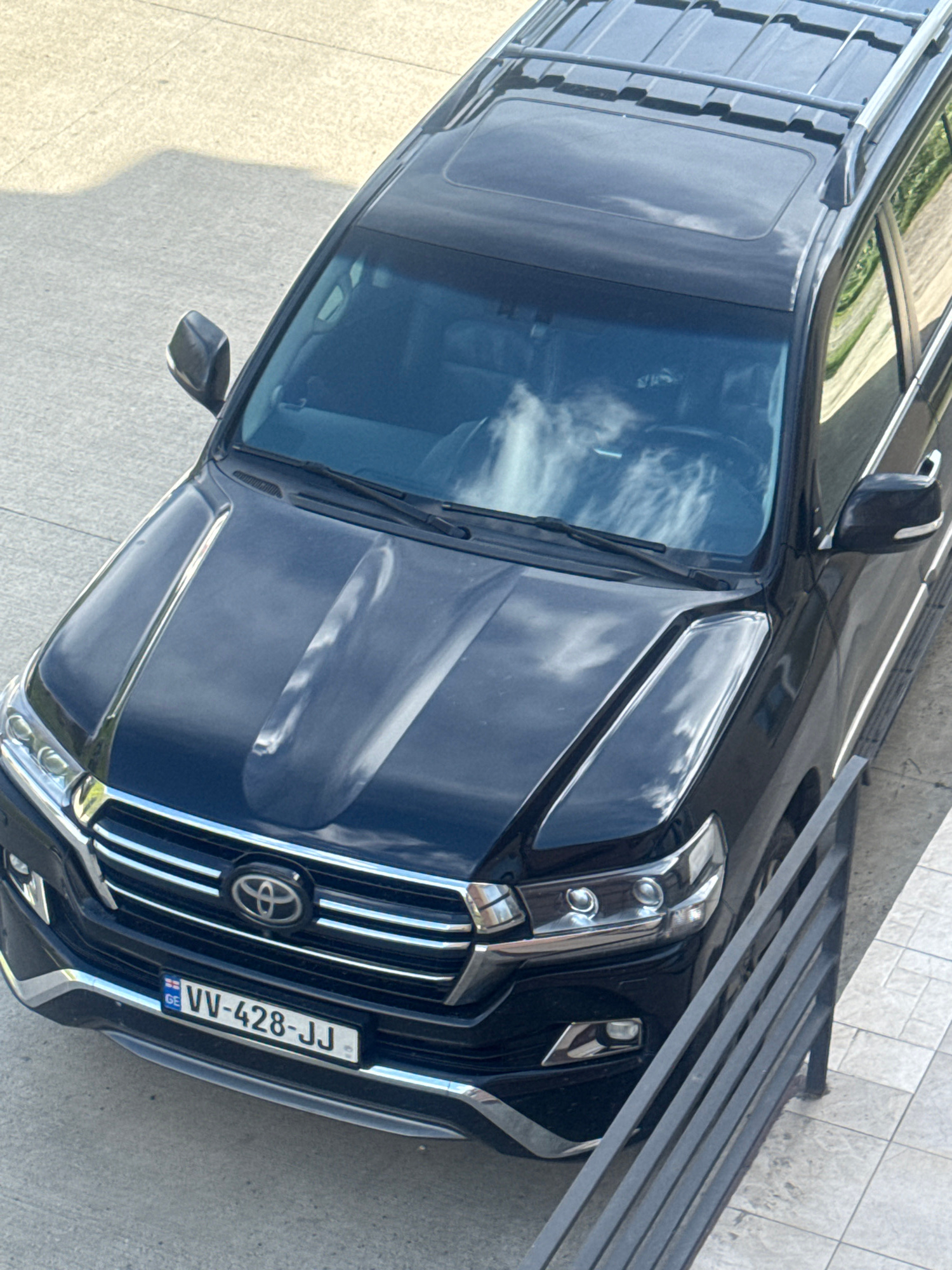 The image is a high-angle close-up of the front of a dark blue Toyota Land Cruiser. The car is parked on a light-colored concrete surface, possibly a sidewalk or driveway. The front grill of the car i…read more