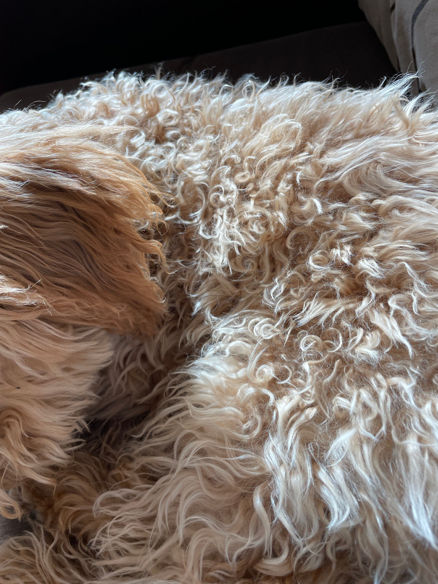 The image shows a close-up view of a dog's fur. The fur is primarily light beige and cream-colored, with a mix of tightly curled and wavy textures. The fur appears dense and somewhat unkempt. There is…read more