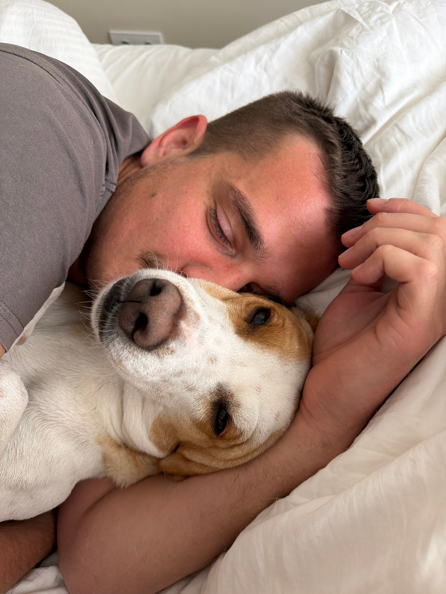 A man and a dog are lying together in a bed with white sheets. The man, who appears to be in his late 20s or early 30s, has dark hair and is wearing a gray t-shirt. He is lying on his side with his ey…read more