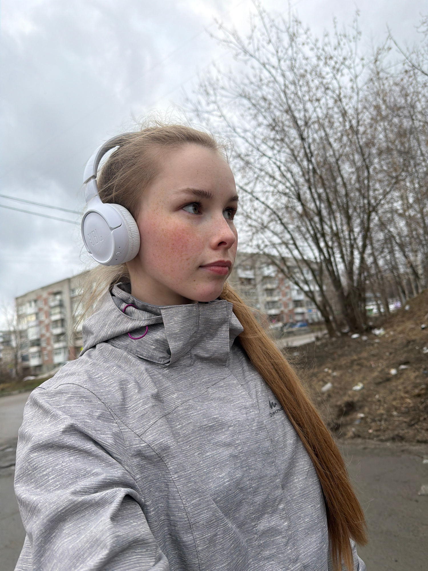 A fair-skinned adolescent female with freckles is the primary subject. She has long, straight, light brown hair partially pulled back, and is wearing white headphones. She is dressed in a heather greyβ¦read more