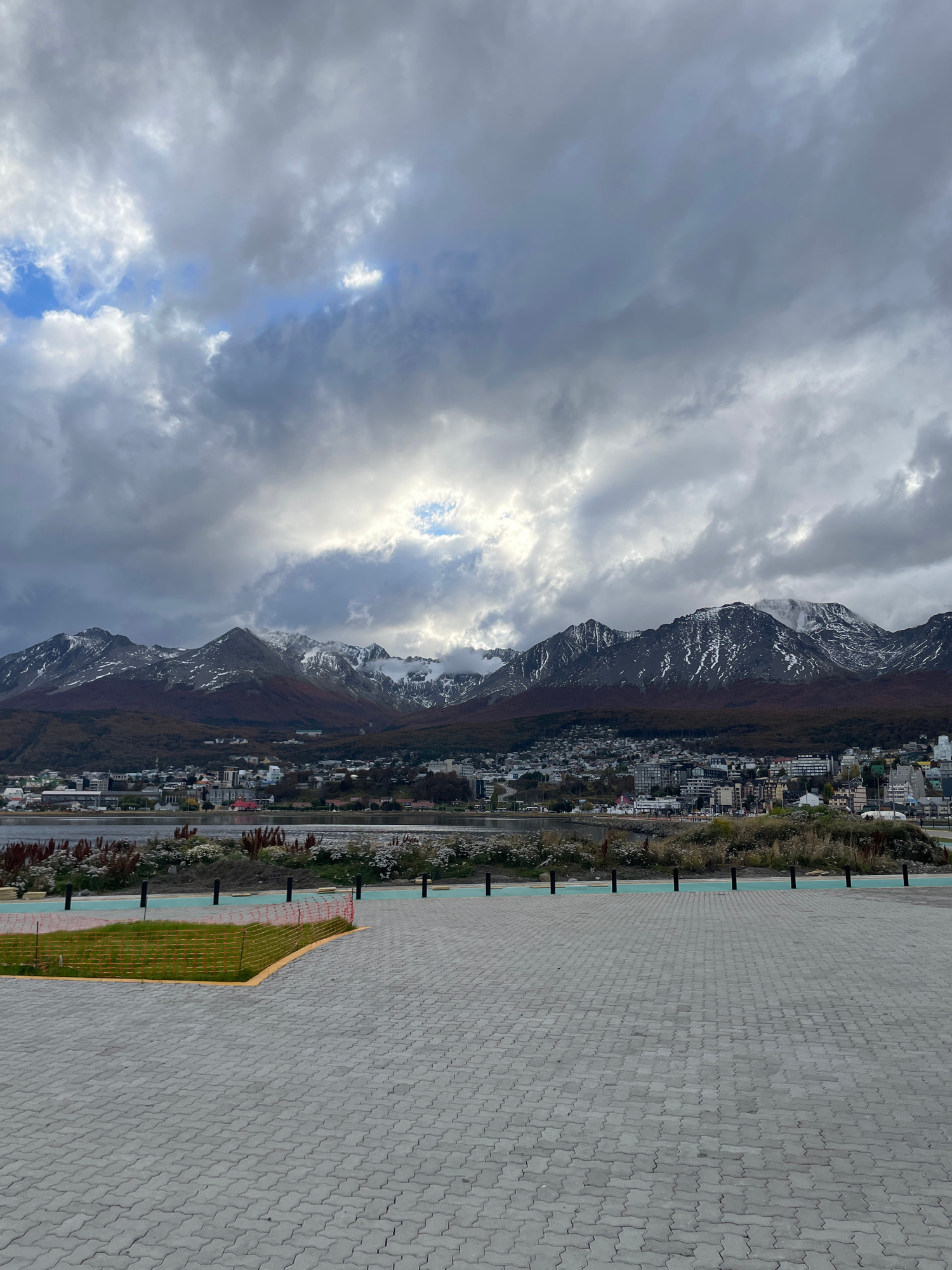 The image captures a mountainous scene in Ushuaia, Argentina, under an overcast sky with glimpses of sunlight breaking through heavy clouds. The landscape features mountains with sparse snow cover, st…read more