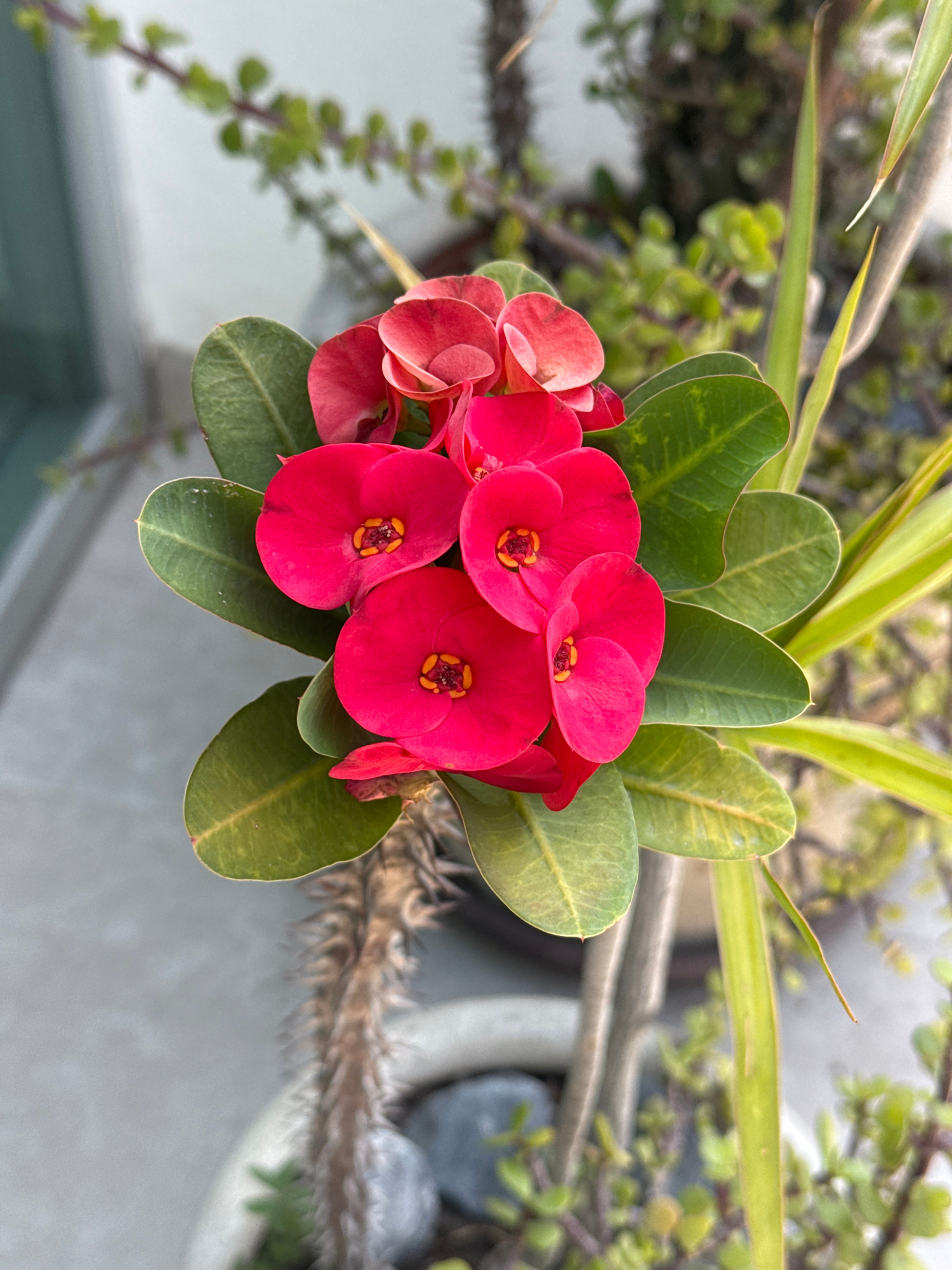 A close-up, high-angle shot depicts a cluster of red Crown of Thorns flowers (Euphorbia milii) surrounded by green leaves and thorny stems. The flowers are a vibrant red with small yellow centers. The…read more