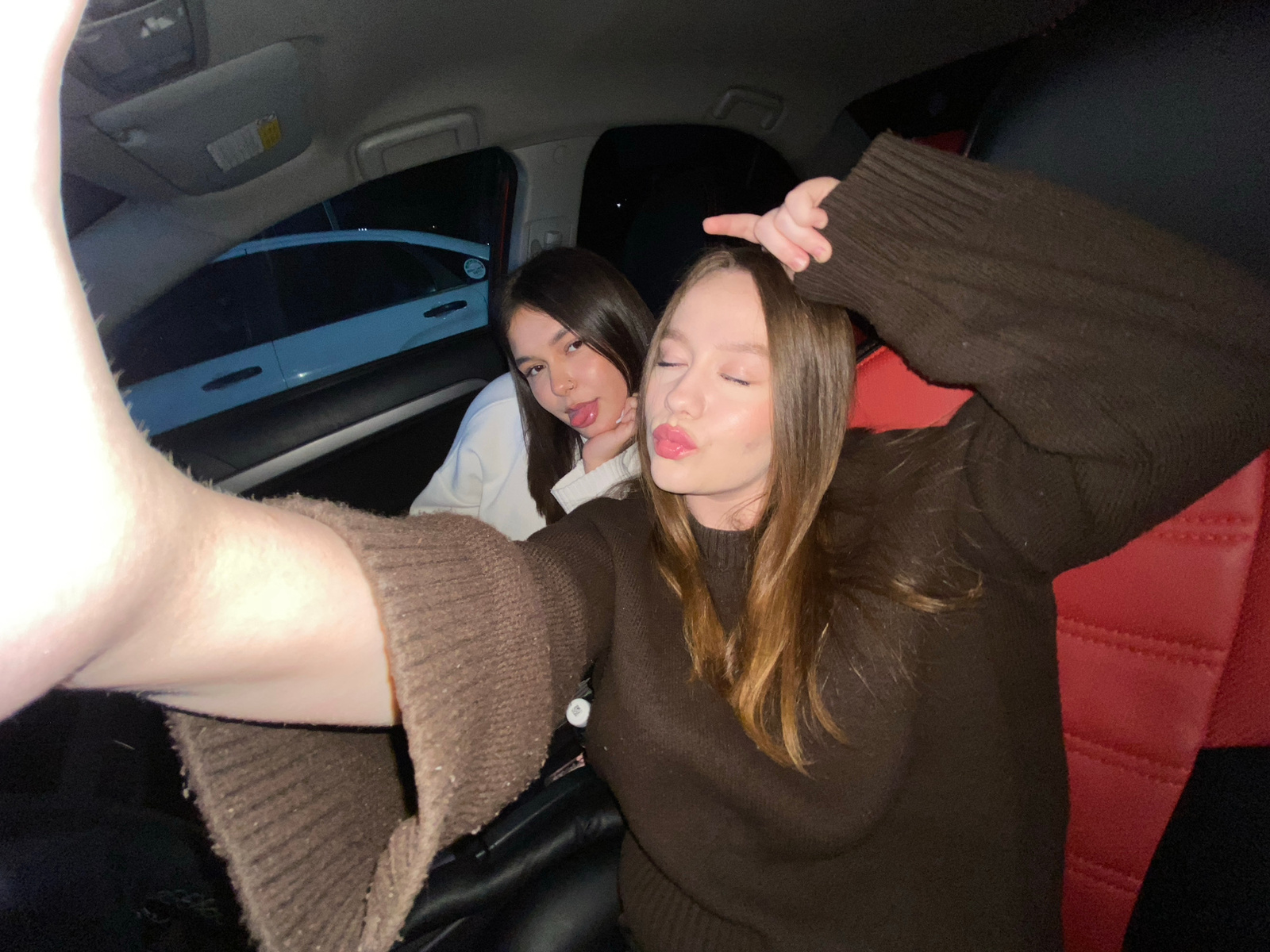 Two young women are taking a selfie inside a car, possibly in Chaikovsky, Russia, though there is no explicit confirmation of the location in the image. The woman on the left has light brown hair and…read more