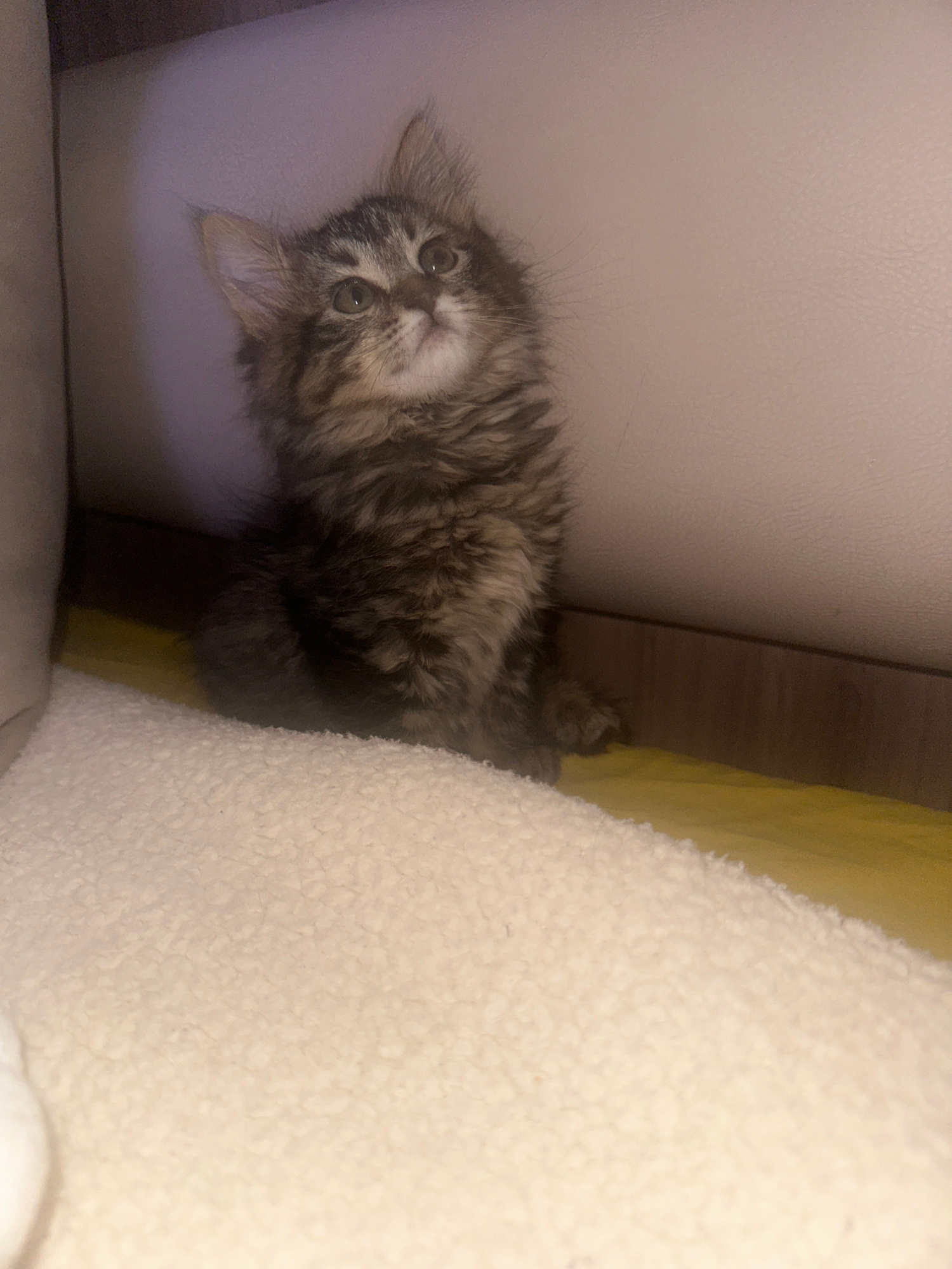 A long-haired tabby kitten with wide eyes is looking up at the camera. The kitten is near a light-colored wall and a fluffy white blanket. The scene doesn't show clear evidence of being in Marrakesh,…read more